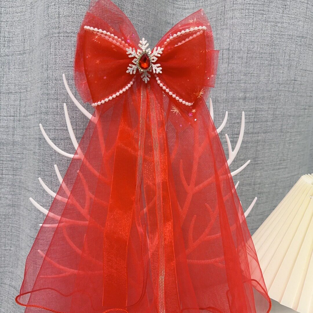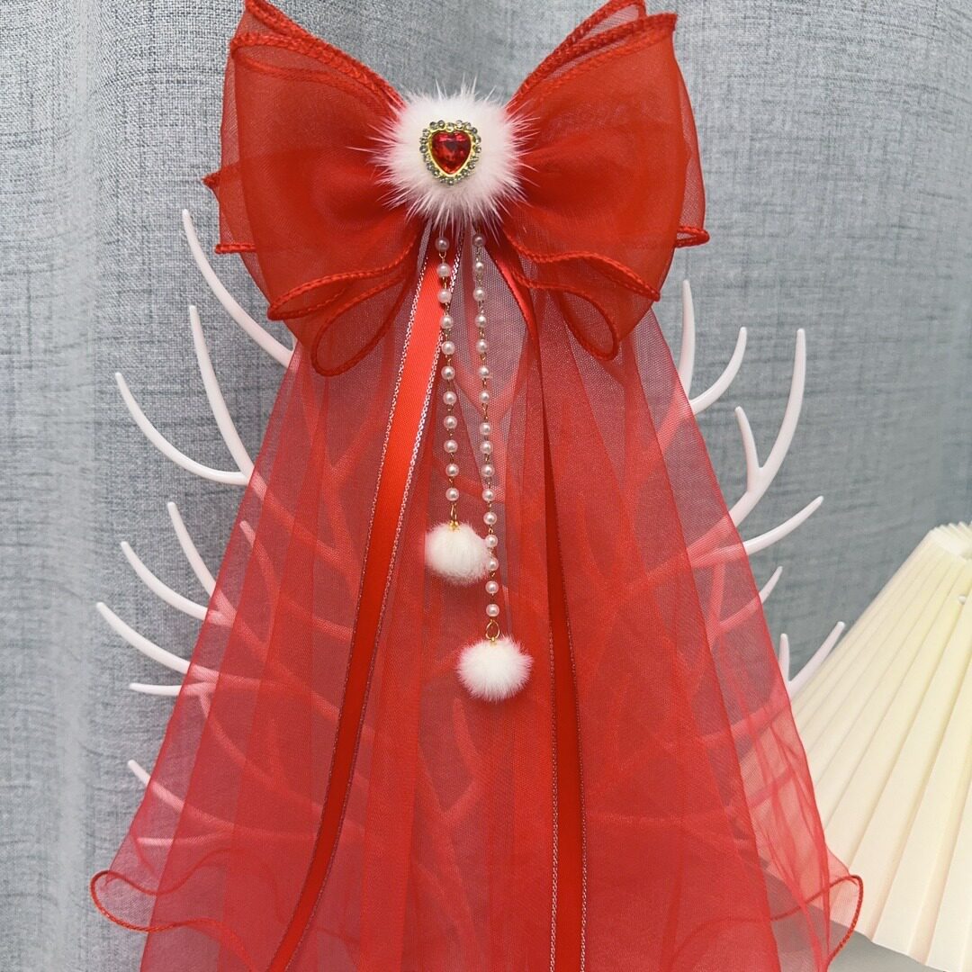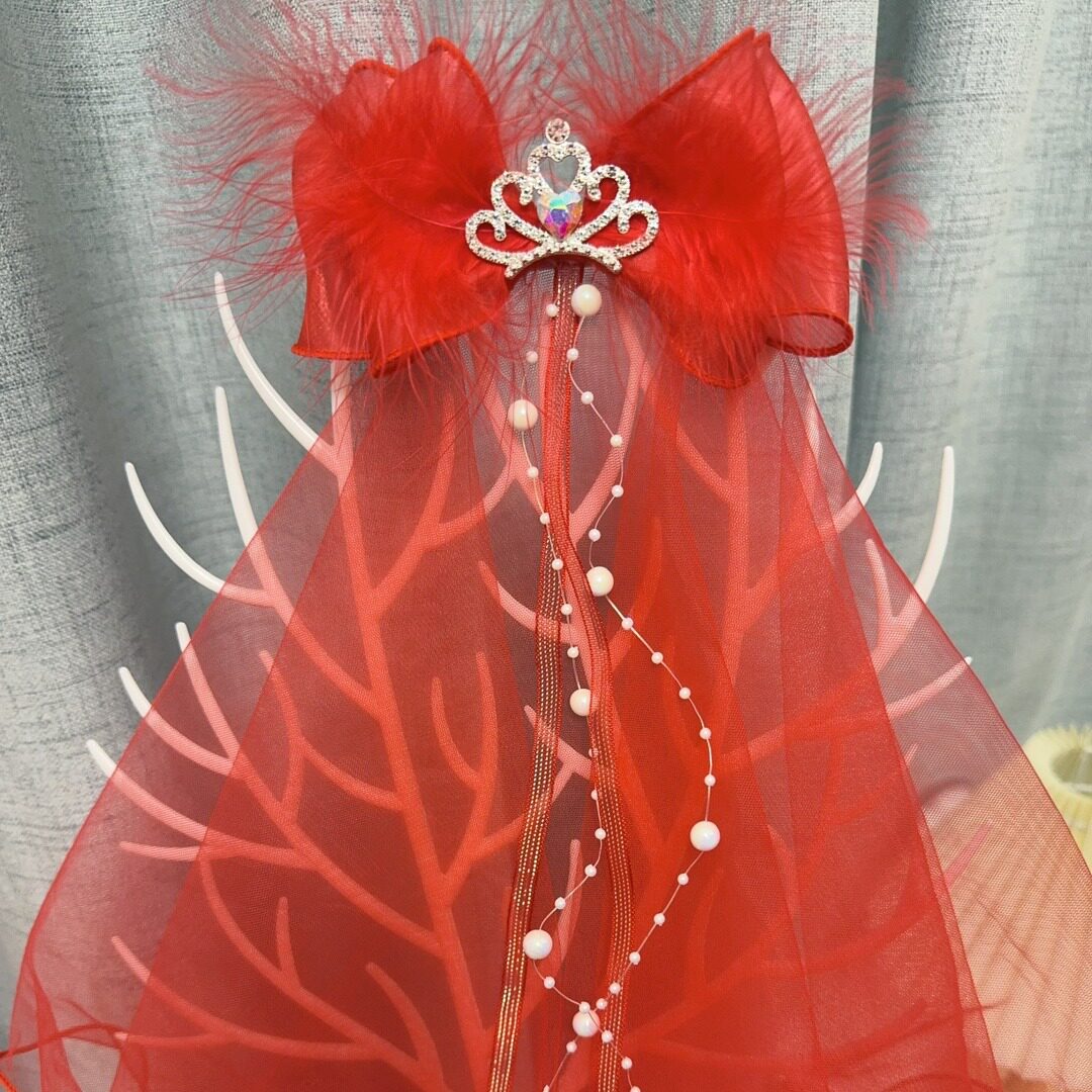 📚 红色长披纱甜美公主蝴蝶结头纱儿童花童发夹头纱过年大红喜庆头