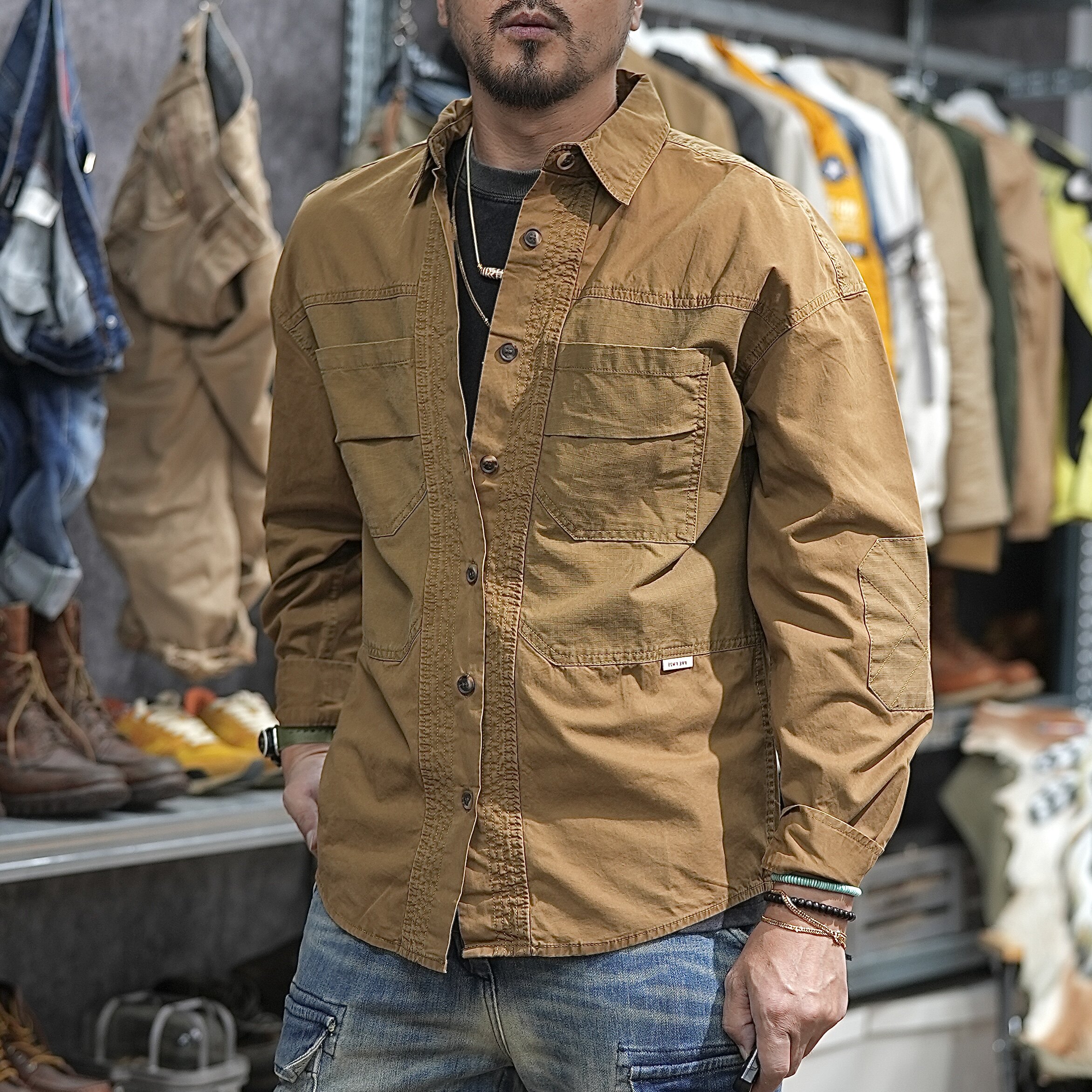 📚 美式猎装版复古拼接工装长袖衬衫男春季潮牌宽松痞帅休闲宽松衬衣