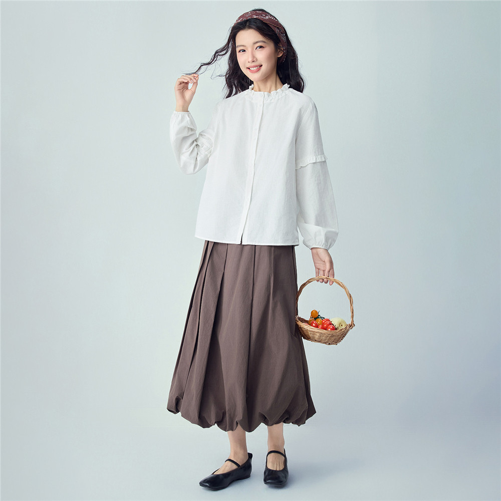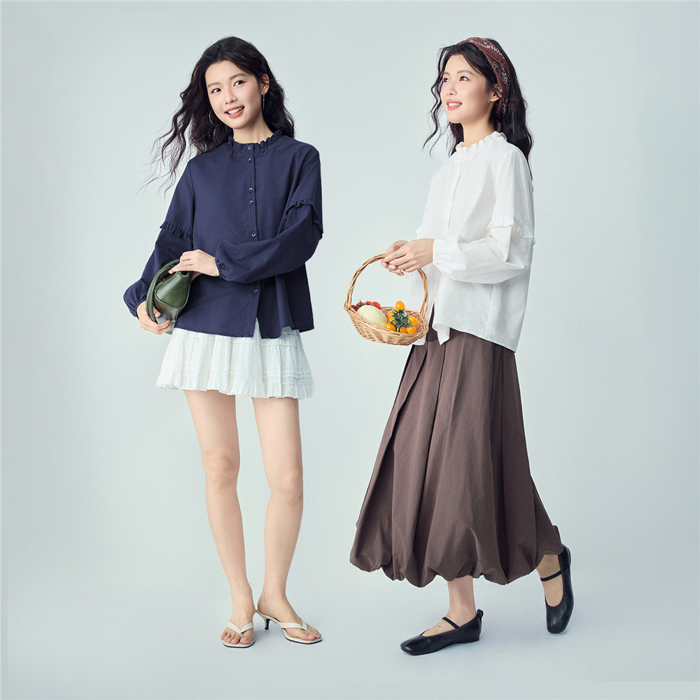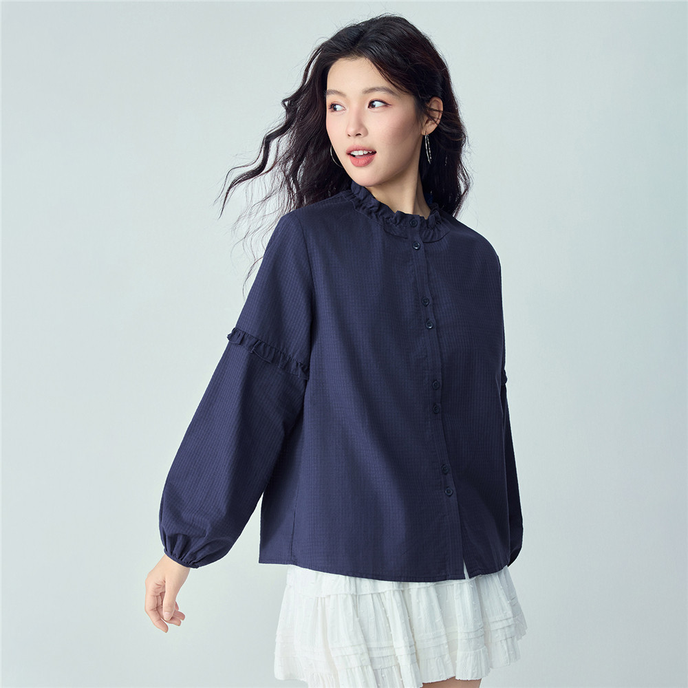 📚 佐丹奴2026年春纯棉暗格纹宽松花边立领灯笼袖衬衫女长袖13346152