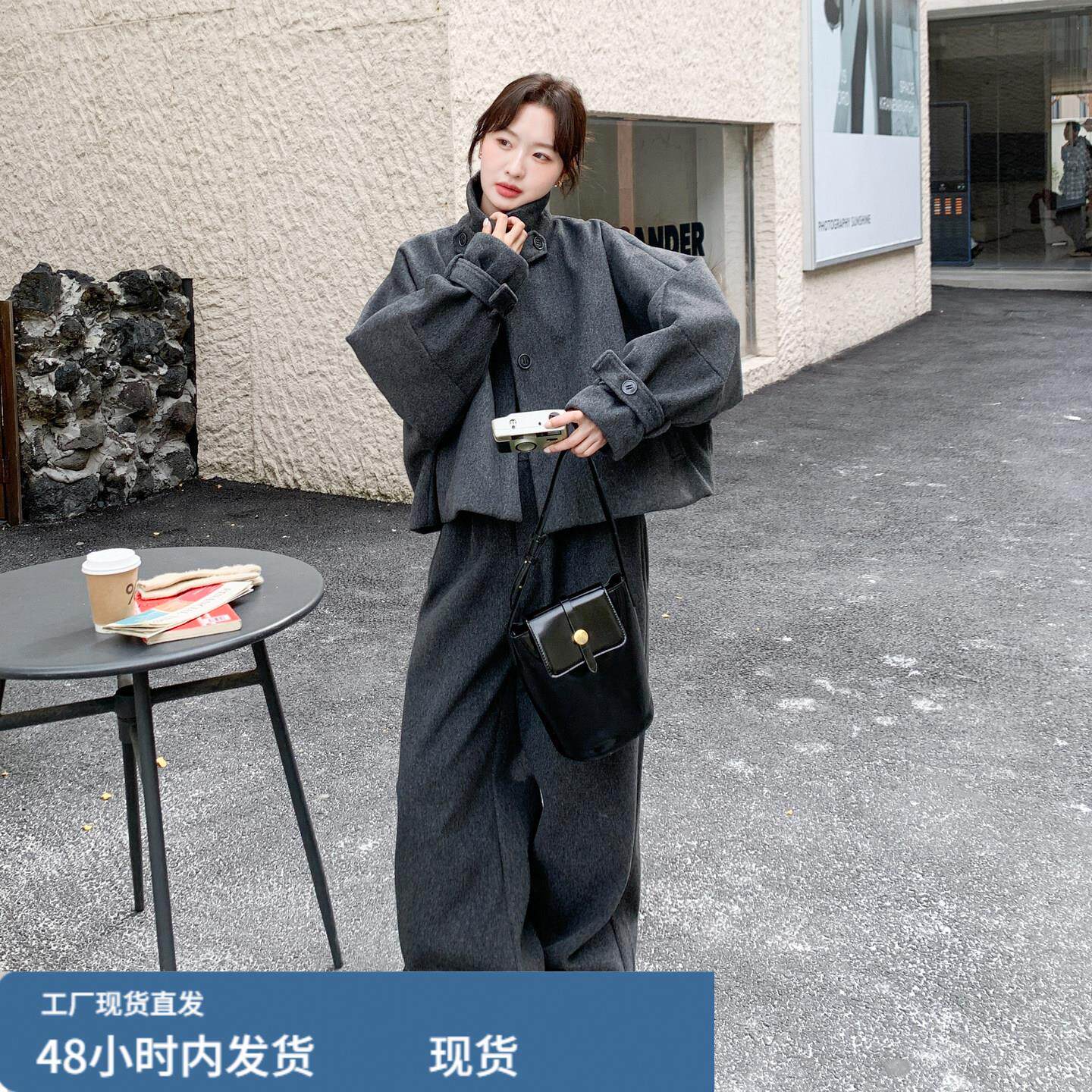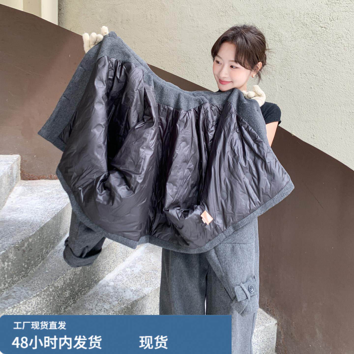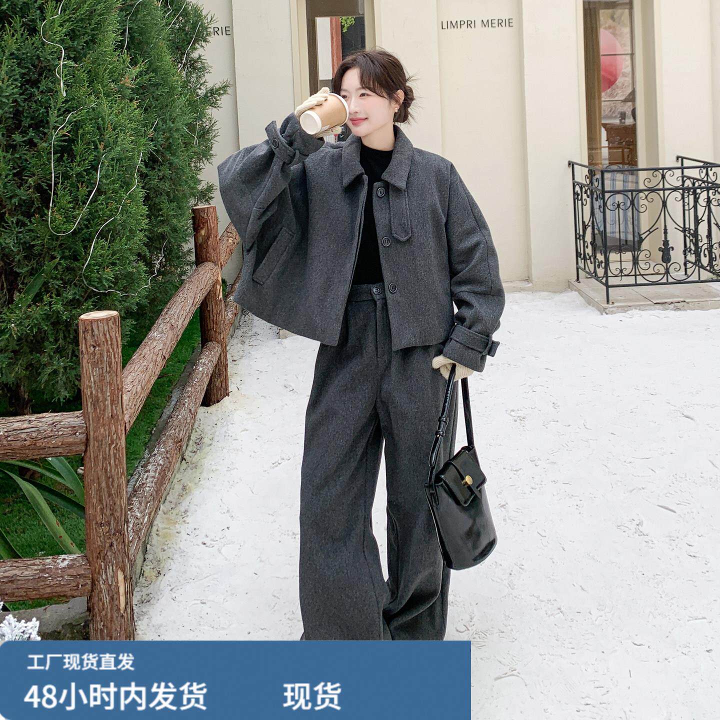 📚 深灰色韩版高级感毛呢羽绒服套装女2025冬季气质淡人阔腿裤两件套