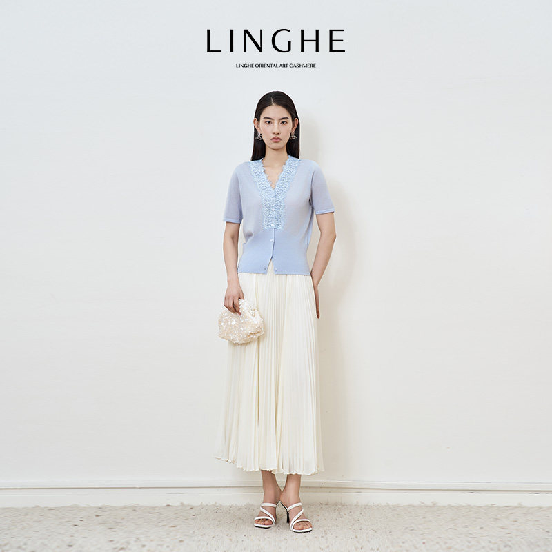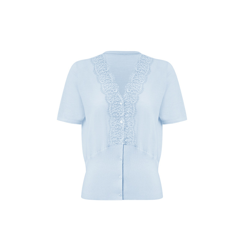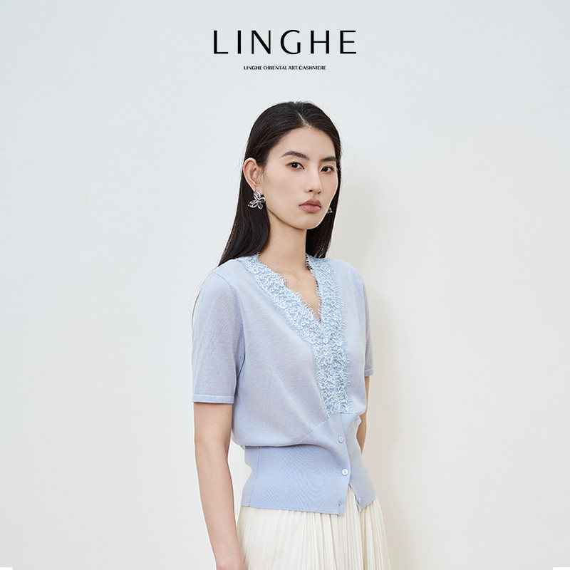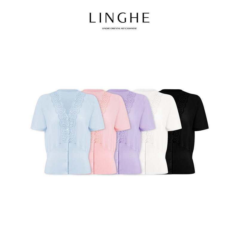 📚 翎禾LINGHE-「莫瑞庄园」超软亲肤V领蕾丝针织短袖开衫