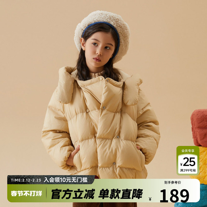 📚 moomoo童装女童短款连帽羽绒服秋冬儿童保暖围脖双排扣羽绒服短款
