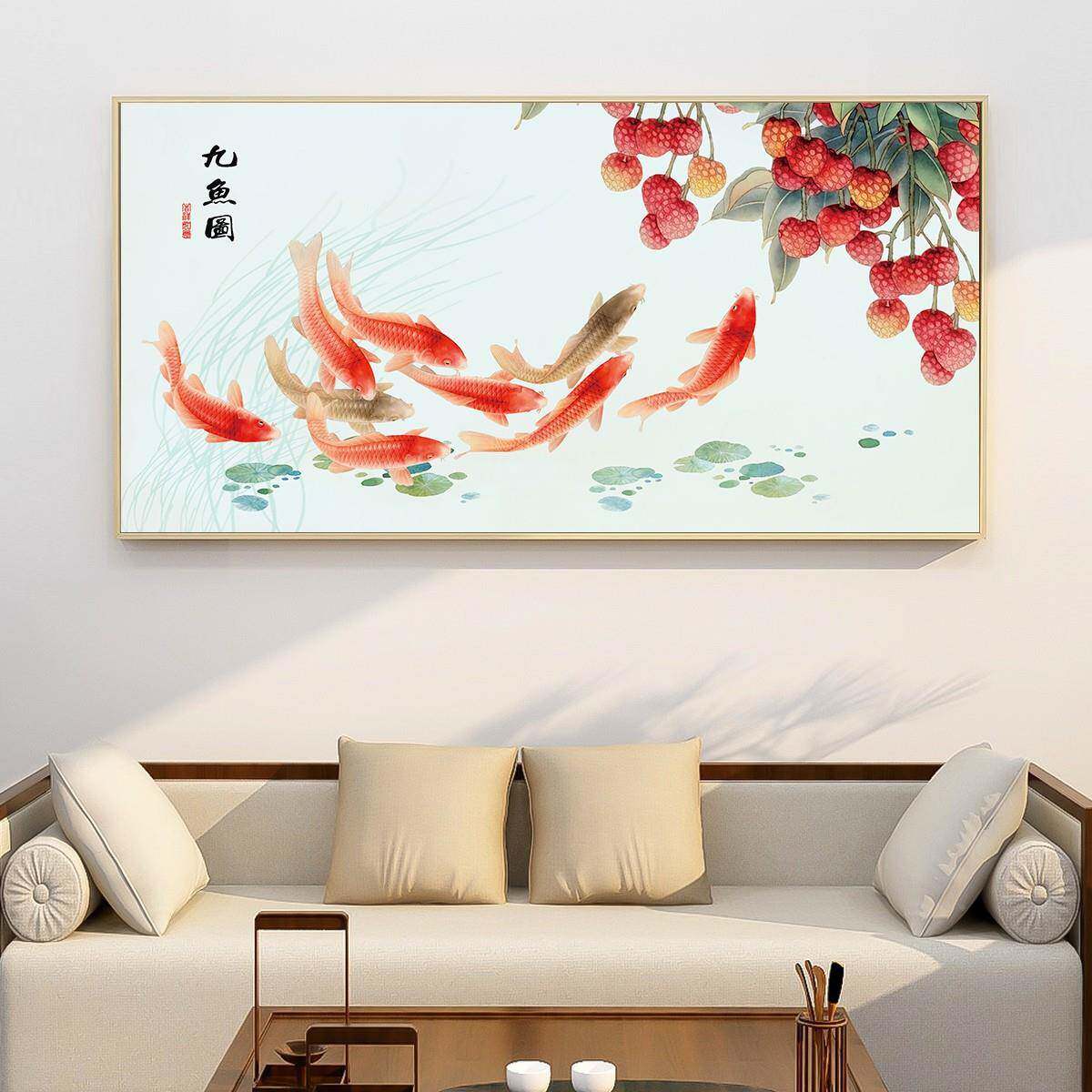 📚 吉大利九鱼图客厅沙装饰画餐好发寓意鲤鱼厅JK1156大荔枝新中式横