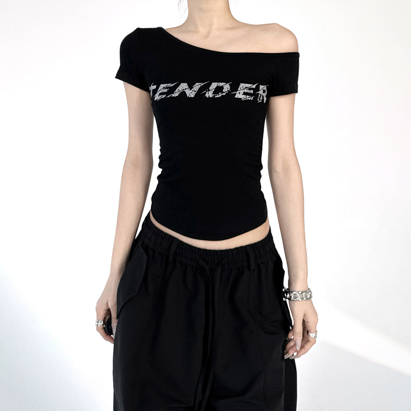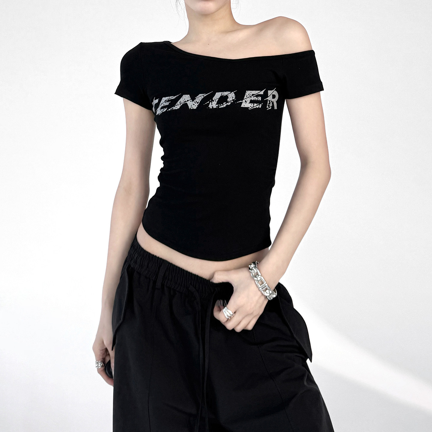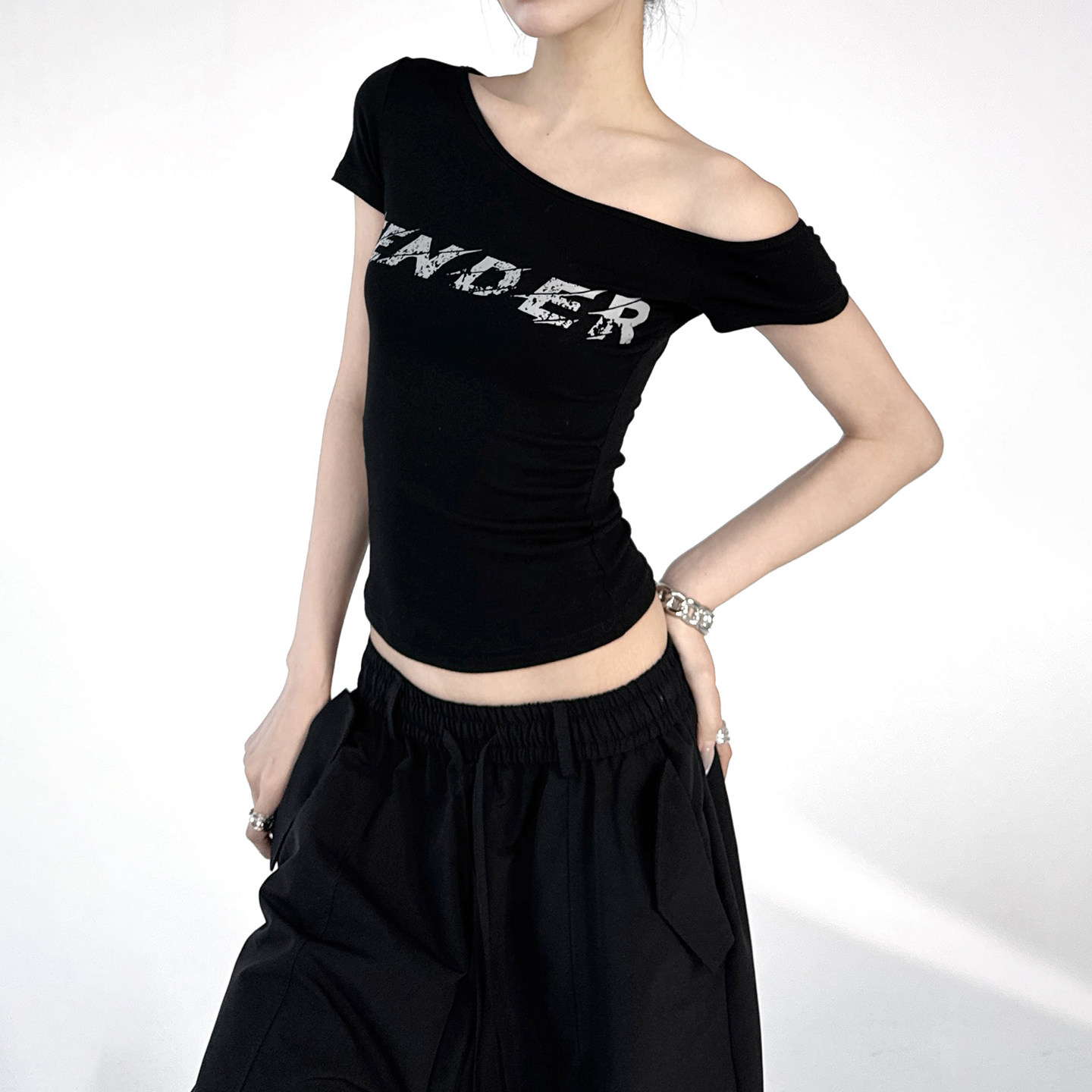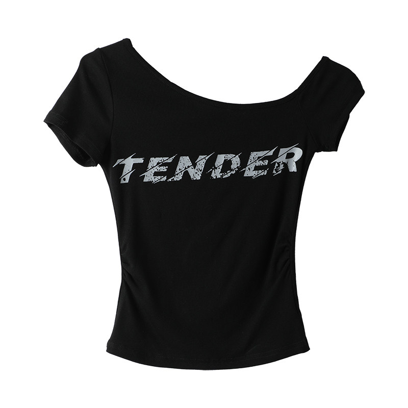 📚 今年流行性感辣妹字母斜肩短袖T恤女2026夏季新款修身短露肩上衣