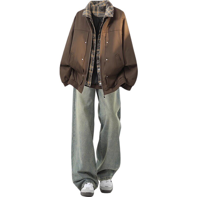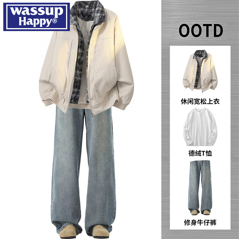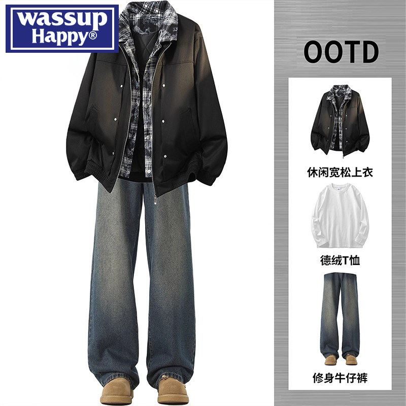 📚 wassup happy假两件翻领夹克男秋冬季新款加绒加厚帅气穿搭一整套