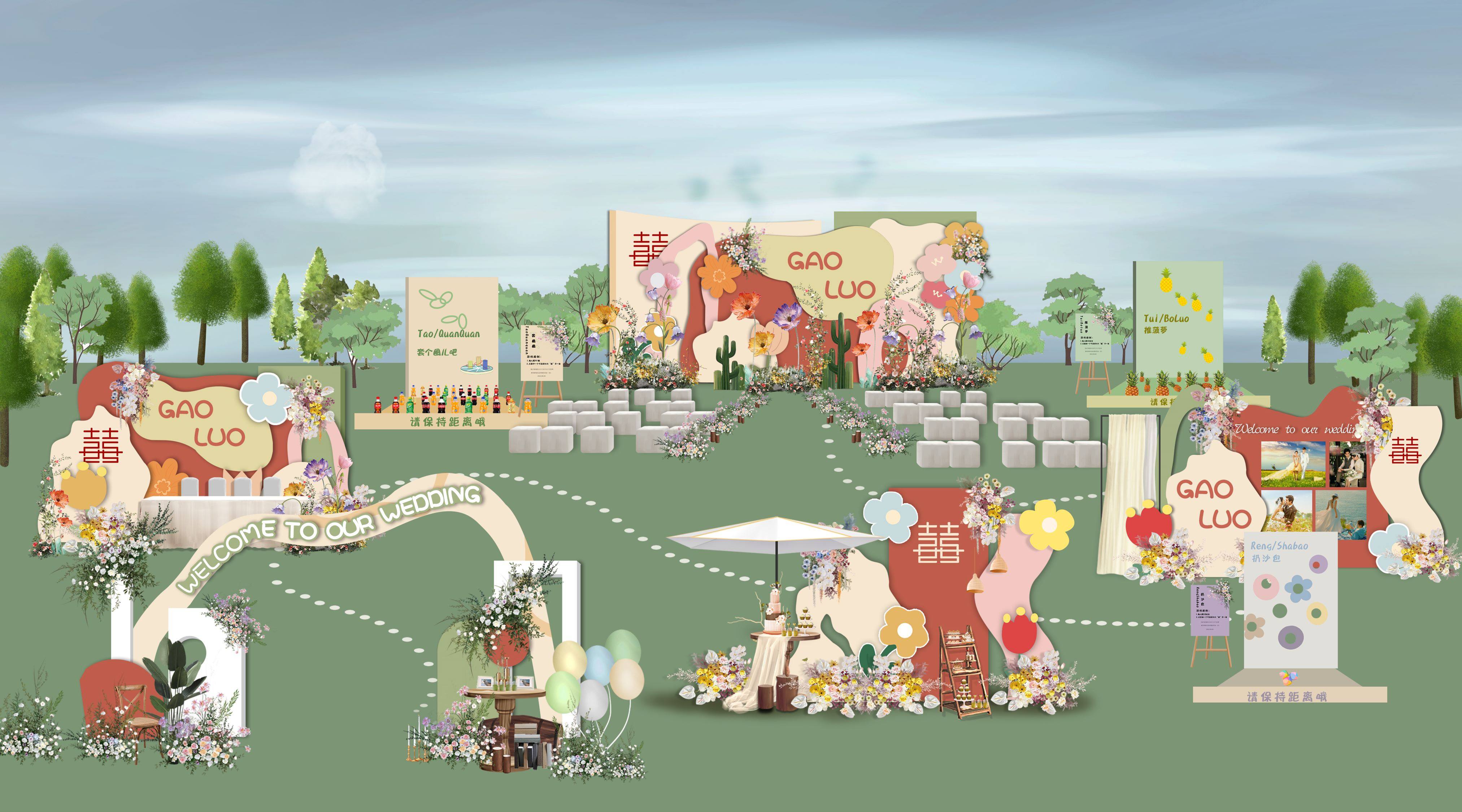 📚 流行多巴胺户外游园会结婚婚礼舞台签到合影甜品区效果图素材PS
