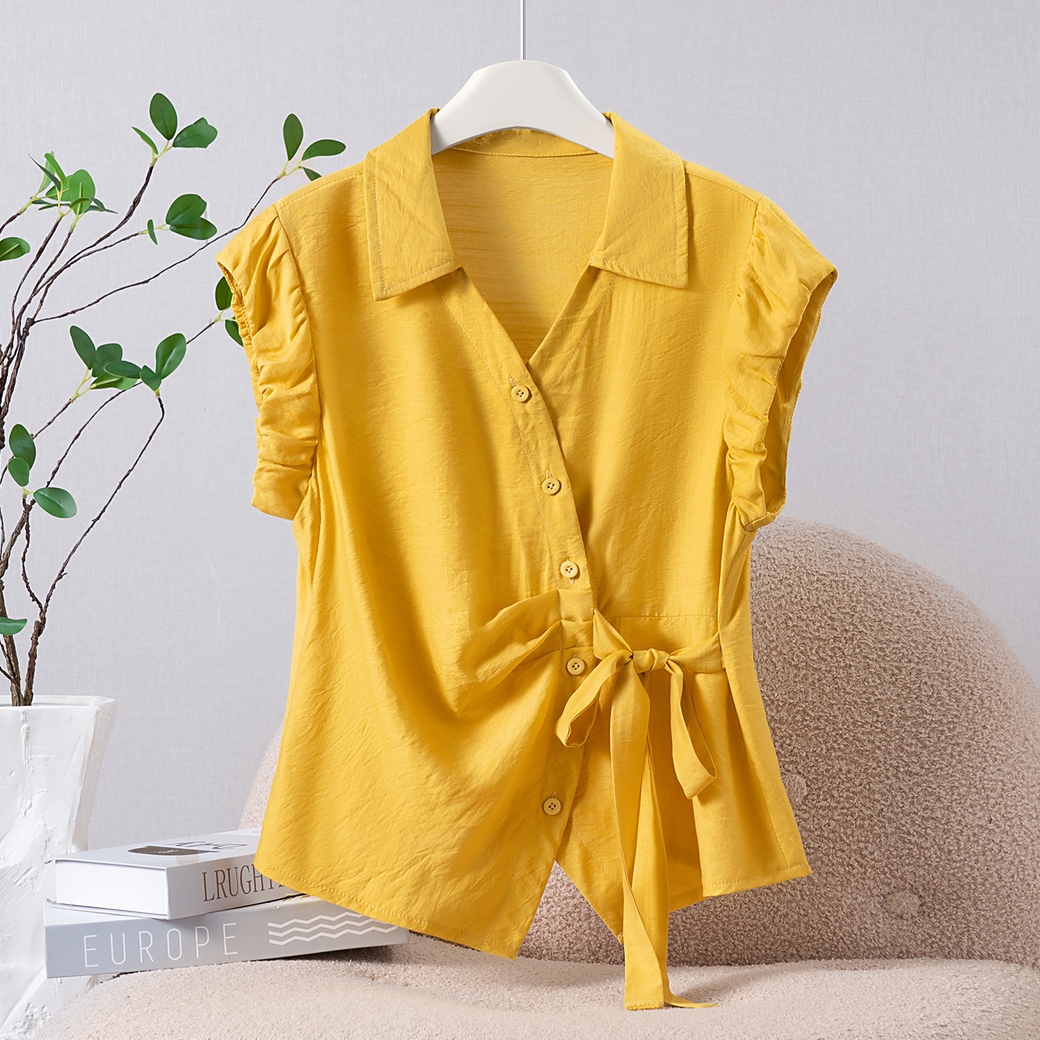 📚 气质polo领收腰绑带衬衣女夏季2026新款不规则开衫小飞袖显瘦上衣
