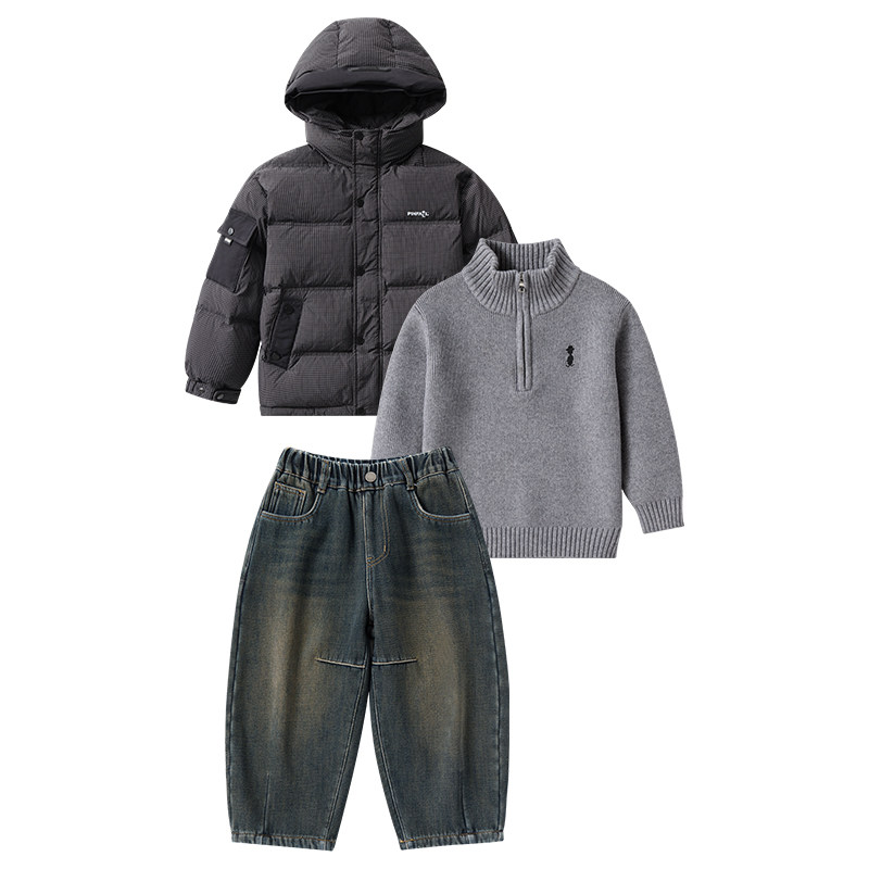 📚 男童保暖套装90白鸭绒羽绒服半高领毛衣加绒牛仔裤2025新款三件套
