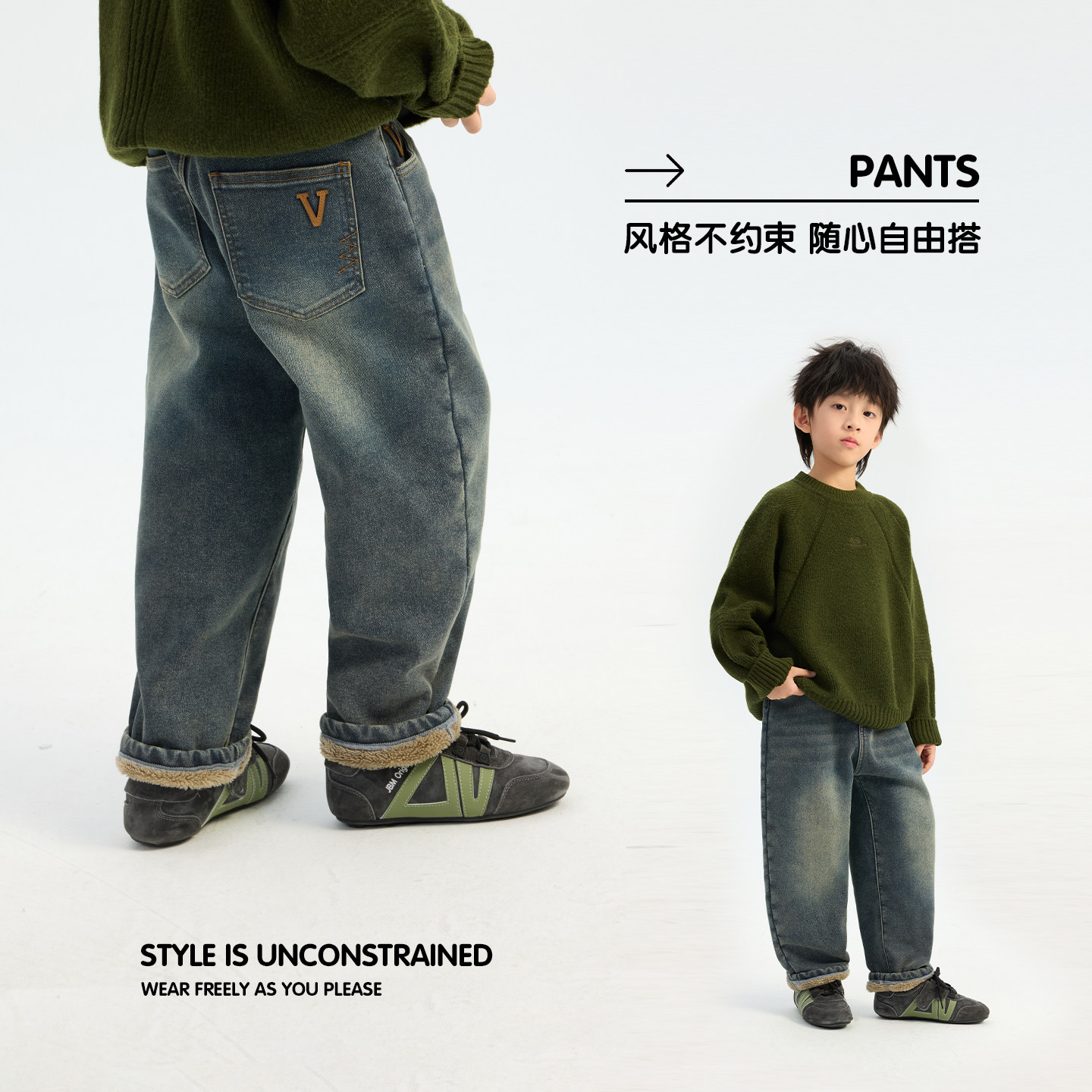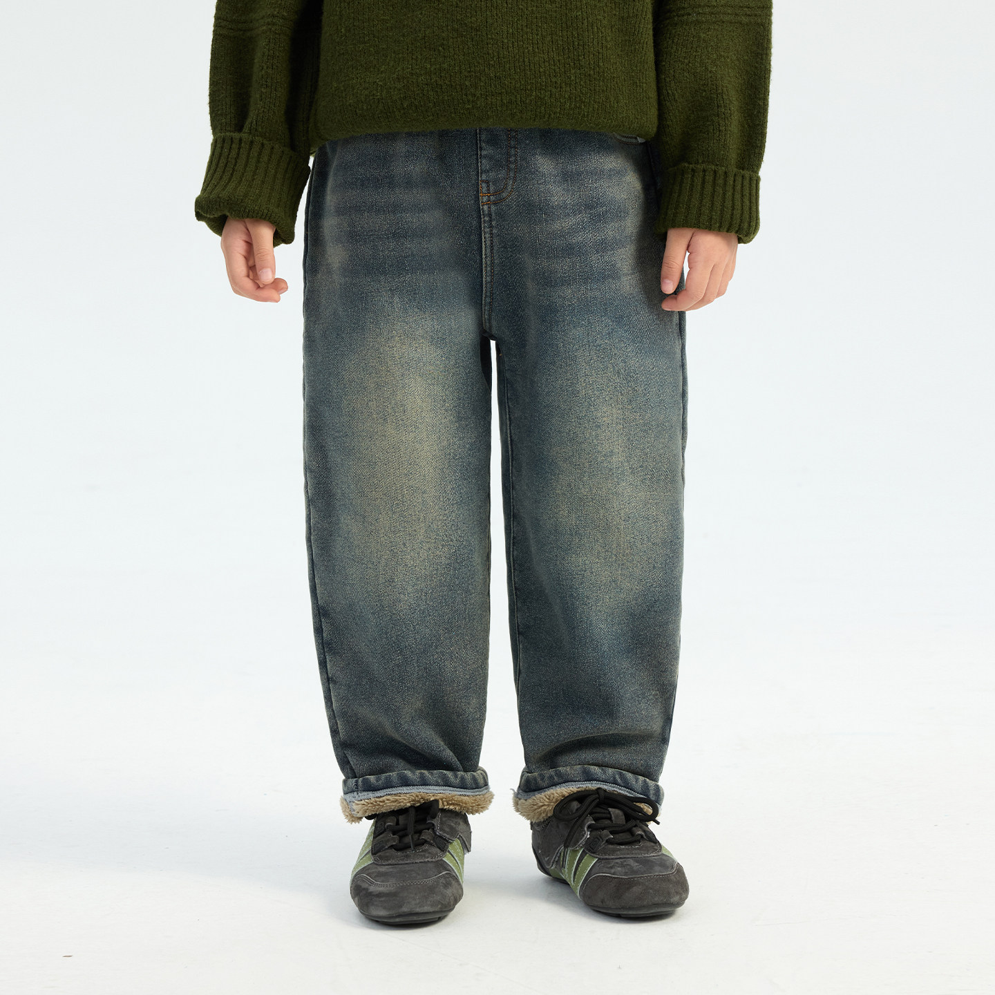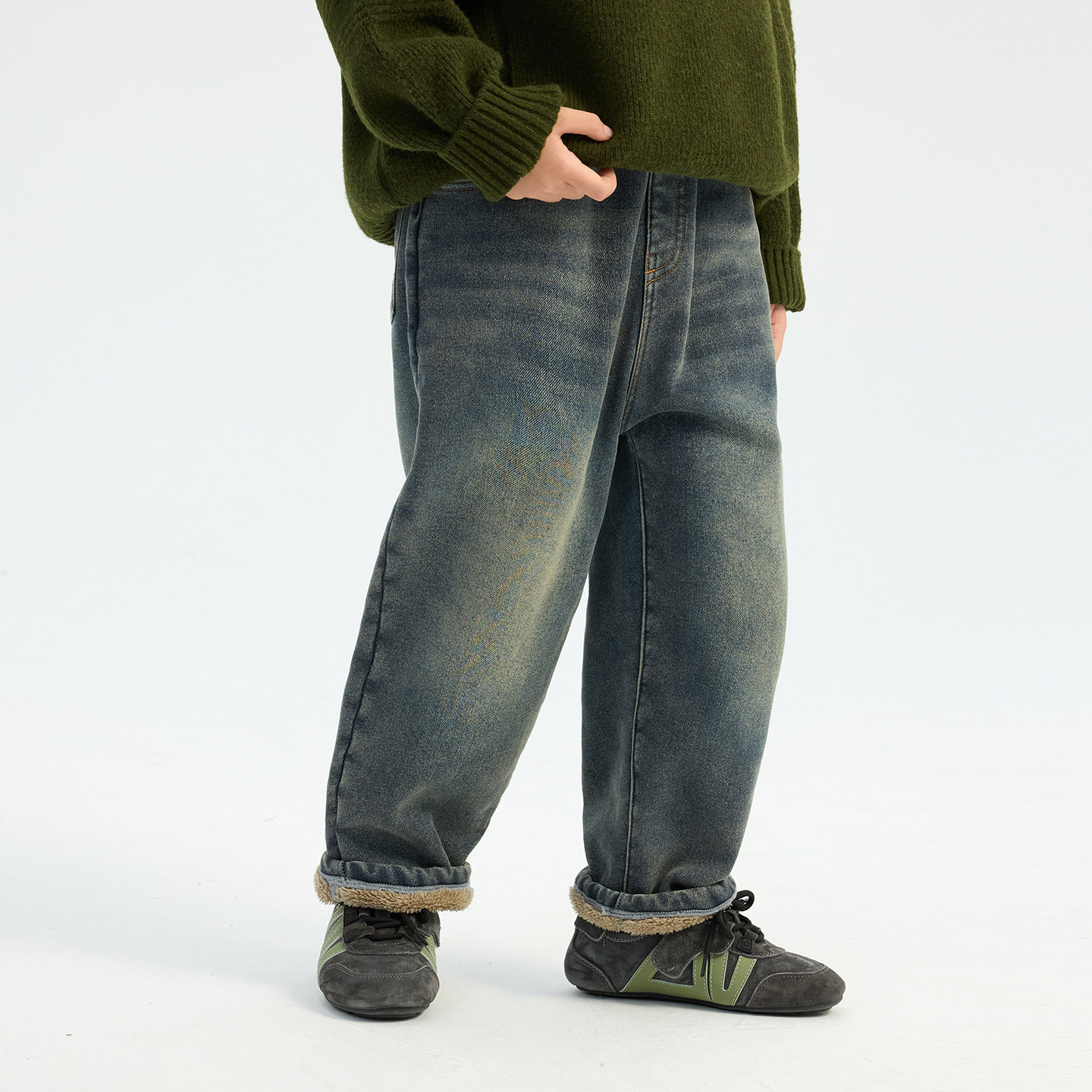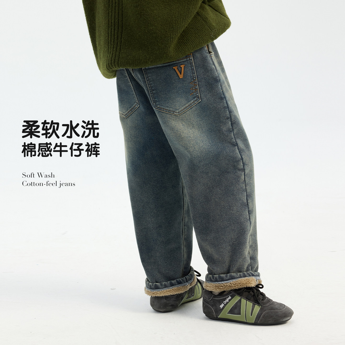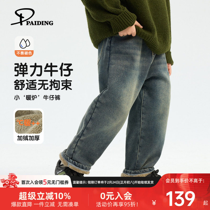 📚 派町童装男童水洗磨白牛仔裤2025冬季新款大童儿童加绒保暖直筒裤