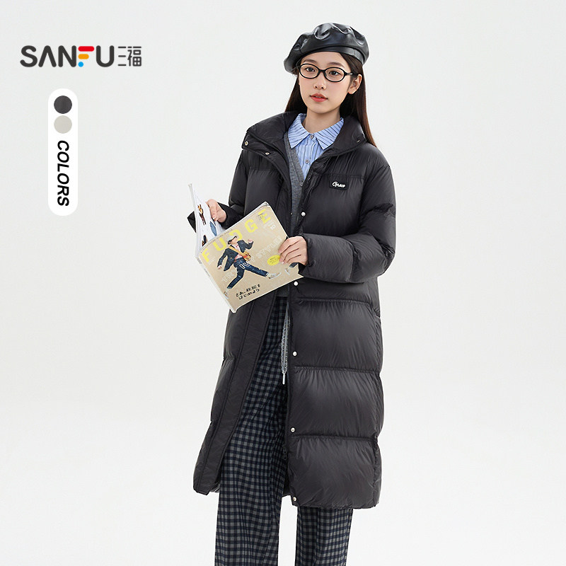 📚 三福羽绒服女2025新款冬季可拆围巾帽宽松长款黑色外套女装506005