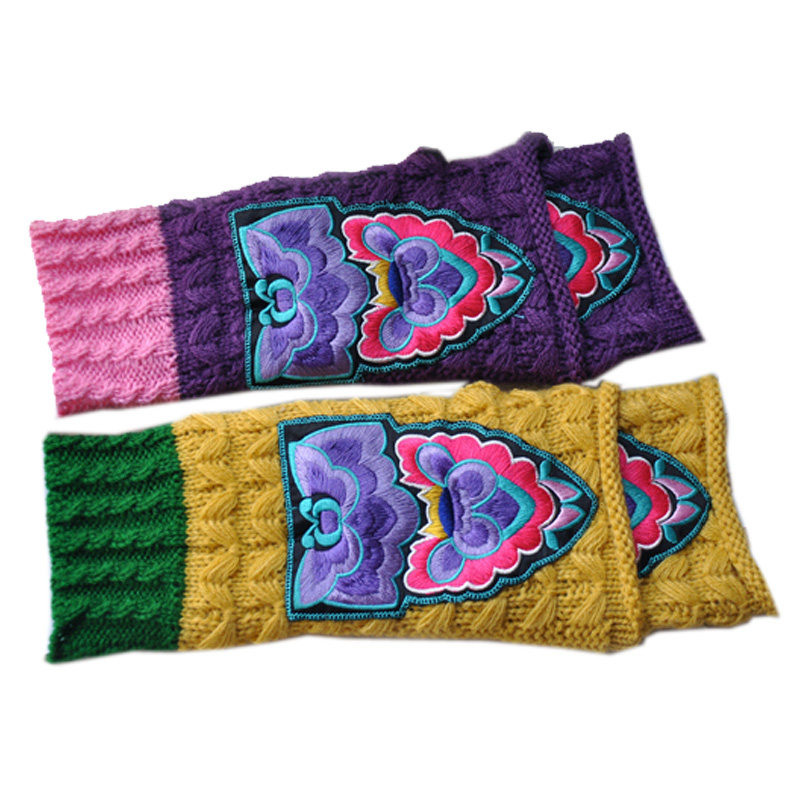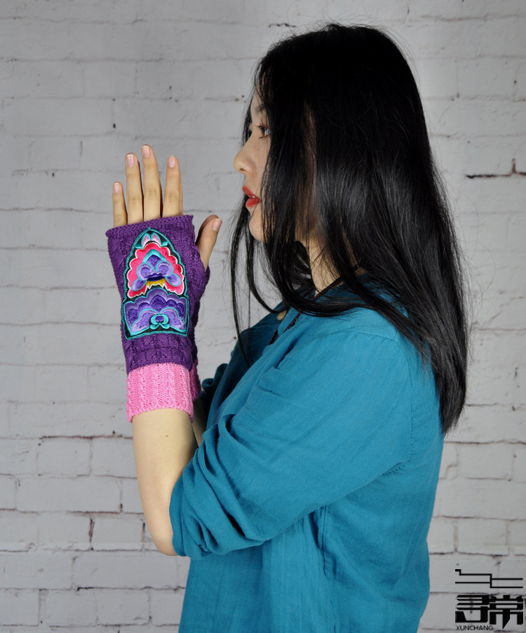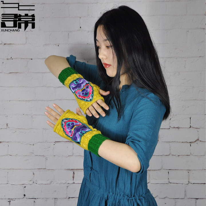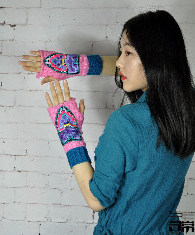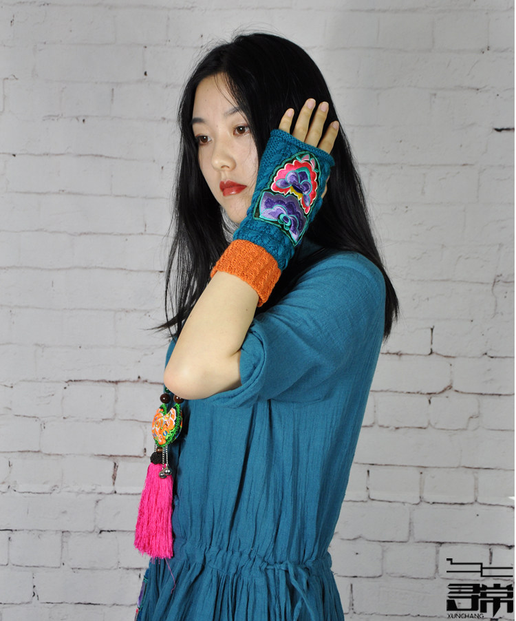 📚 中式民族风保暖中长筒绣花手套文艺手镯半指露指手套刺绣护腕护手
