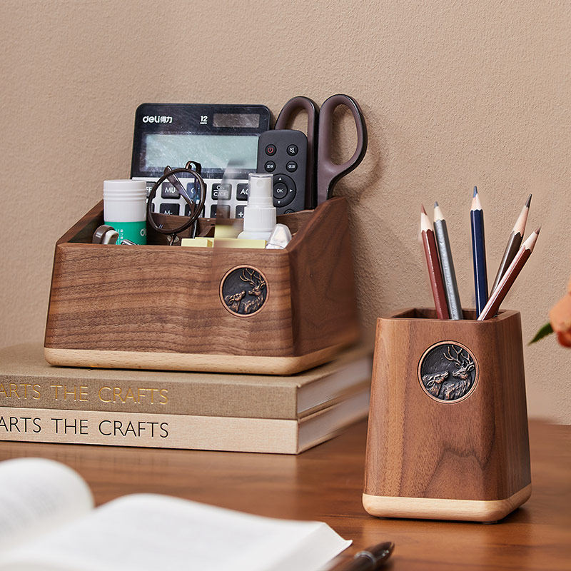 📚 实木化妆刷收纳盒黑胡桃木中国风笔筒办公室学生桌面文具用品摆件