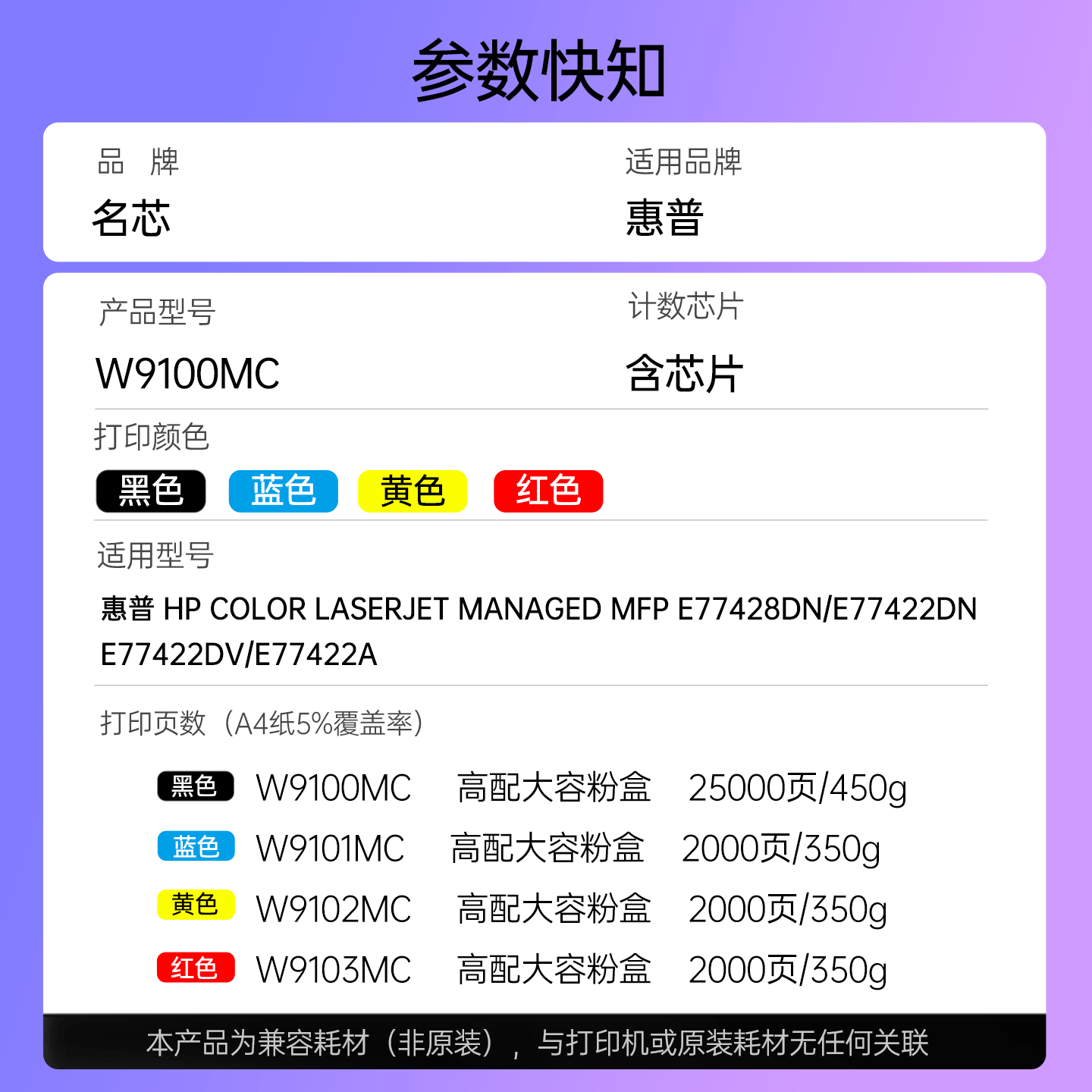 📚 名芯适用惠普E77422dn粉盒E77428dn 碳粉HP W9100MC硒鼓墨粉盒W9101MC W9102MC W9103MC复印机彩色墨盒