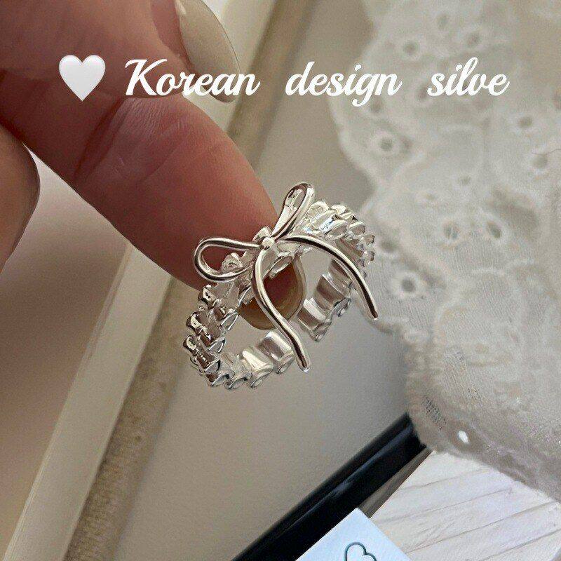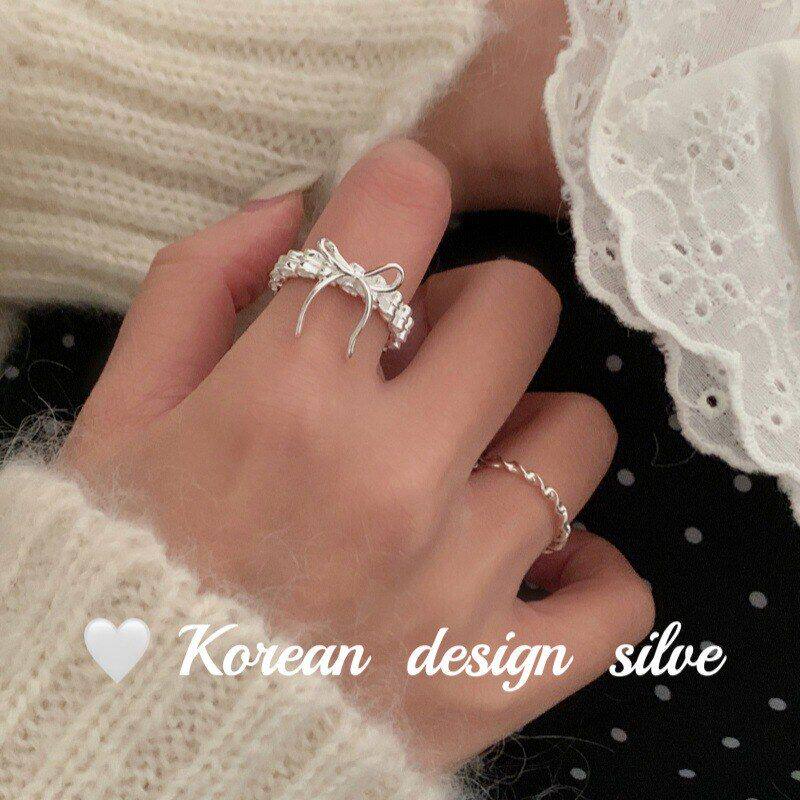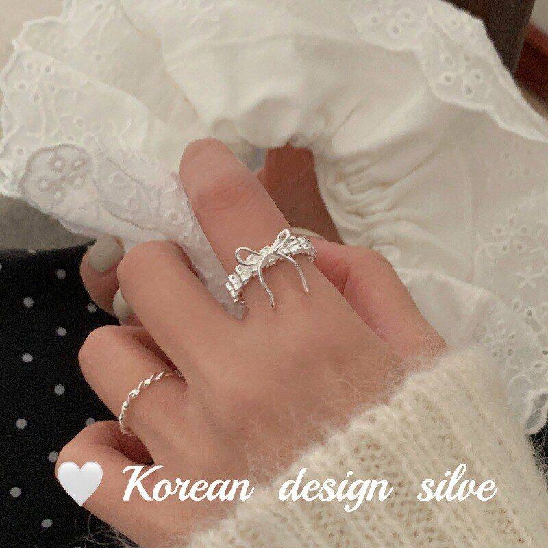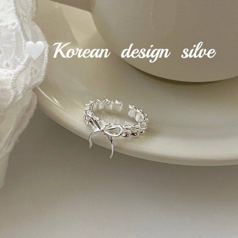 📚 设计时髦蝴蝶结银饰褶皱韩版镂空 女ins戒指纯银S925风小众高级感