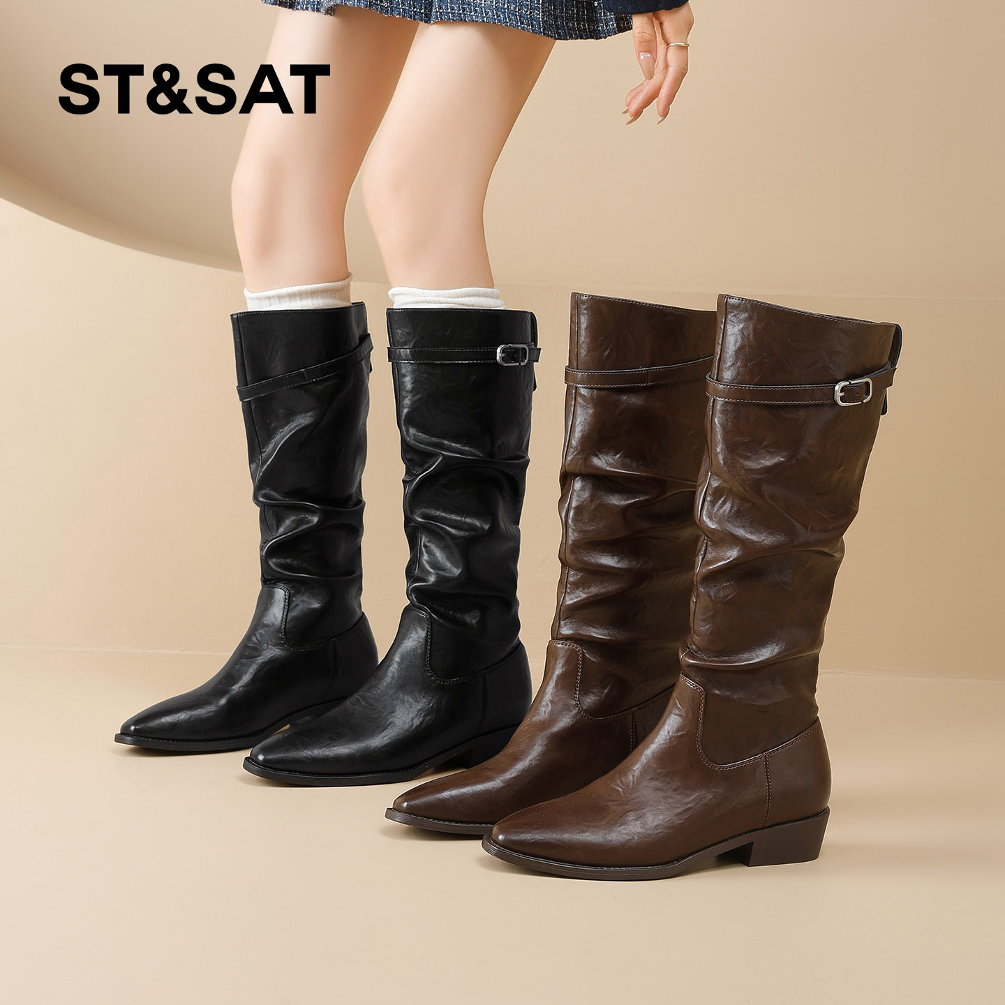 📚 星期六复古尖头骑士靴女2025冬季新款粗跟加绒堆堆靴子高筒瘦瘦靴