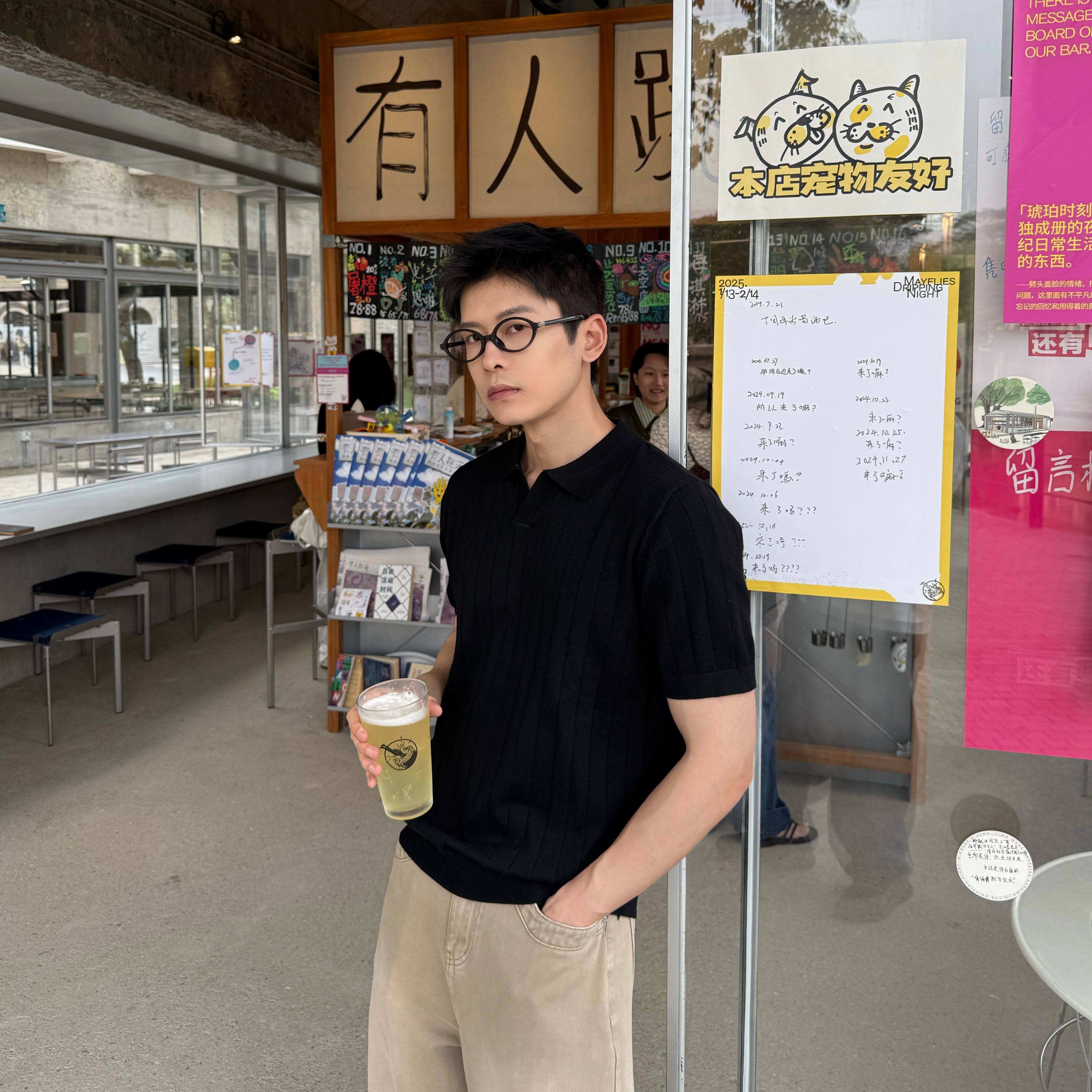 📚 马克斯星球 韩系黑色亨利领针织冰丝短袖男生基础款简约休闲上衣