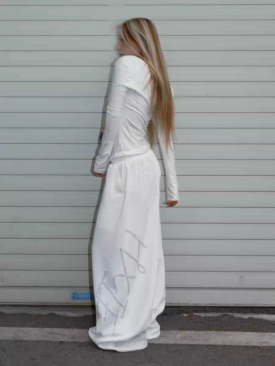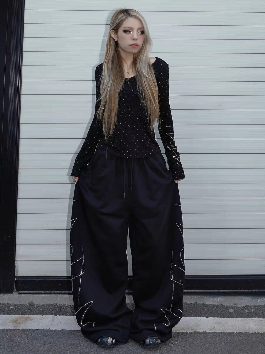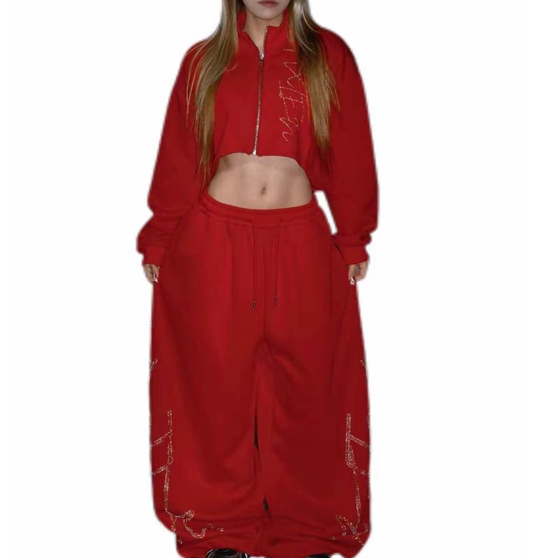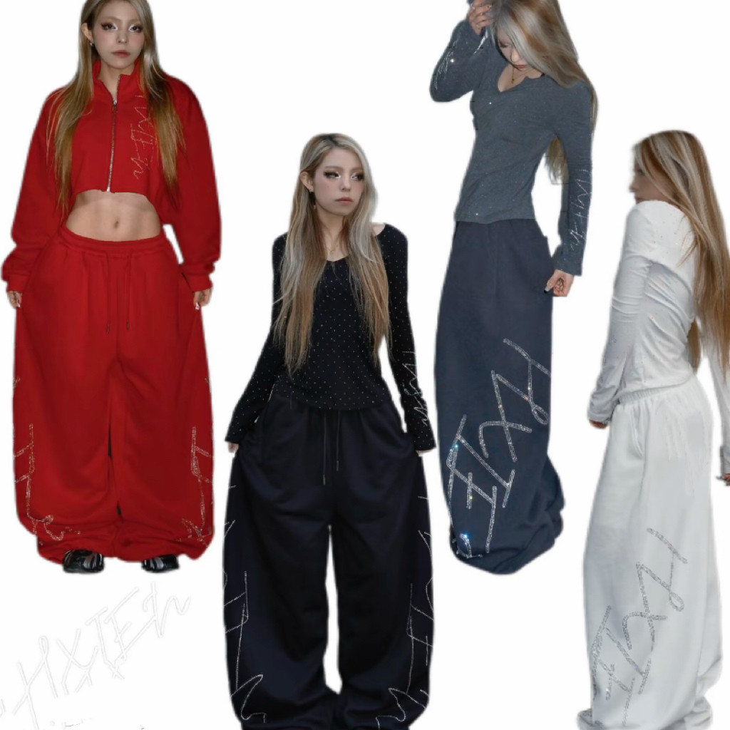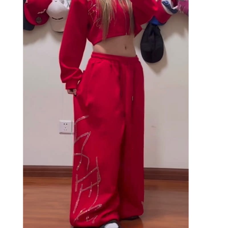 📚 美式红色烫钻休闲裤女街舞嘻哈宽松直筒阔腿裤爵士jazz跳舞长裤子