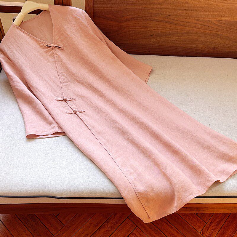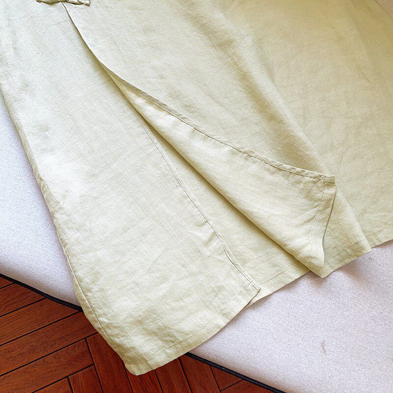 📚 【素心】夏季文艺气质V领砂洗苎麻下摆开叉苎麻中长款袍子 51503