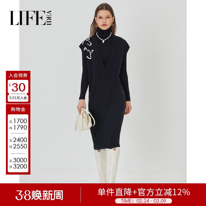 📚 莱芙艾迪儿秋冬新款休闲慵懒风V领针织连衣裙女简约百搭背心裙
