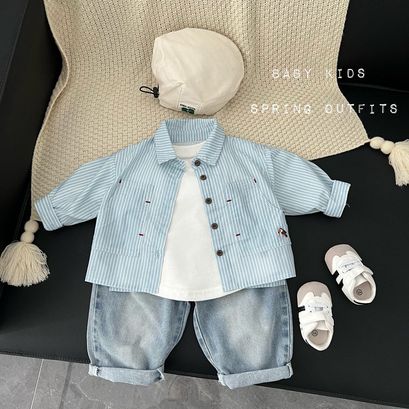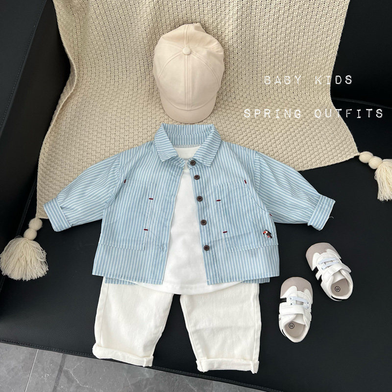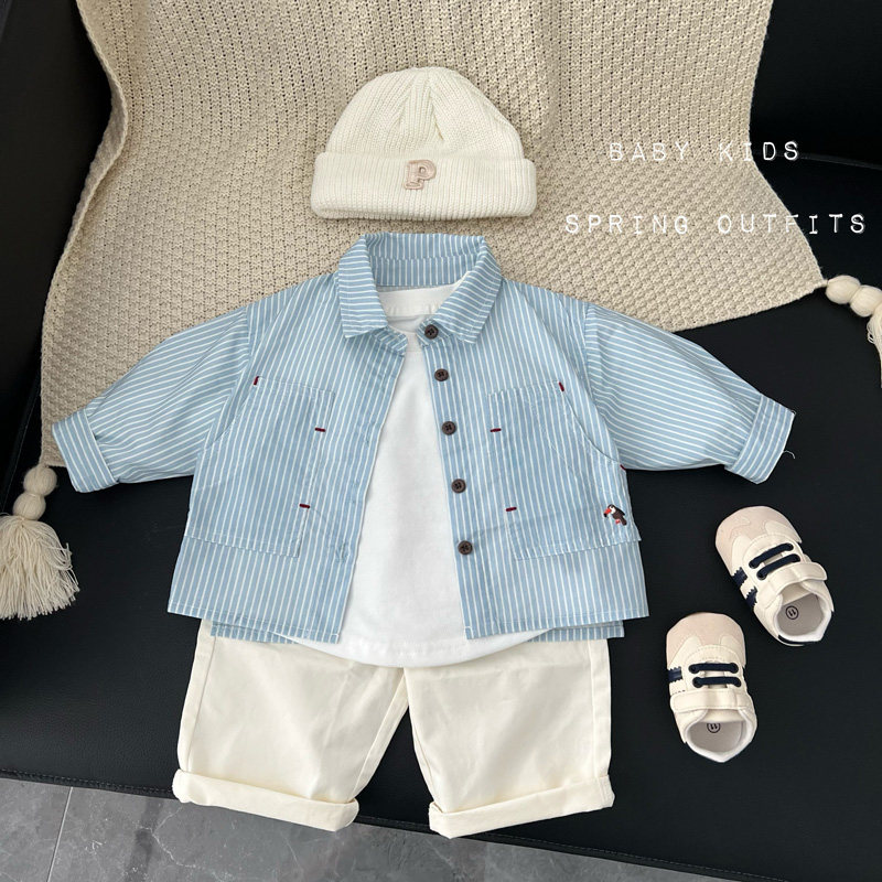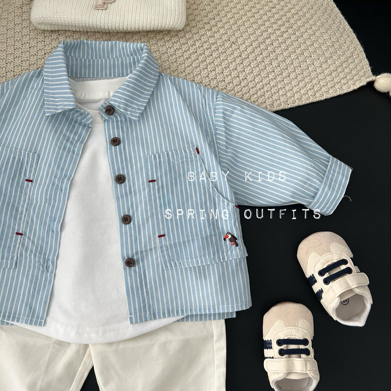 📚 男童春秋帅气衬衫婴幼儿条纹翻领开衫上衣宝宝百搭洋气外出衬衣潮