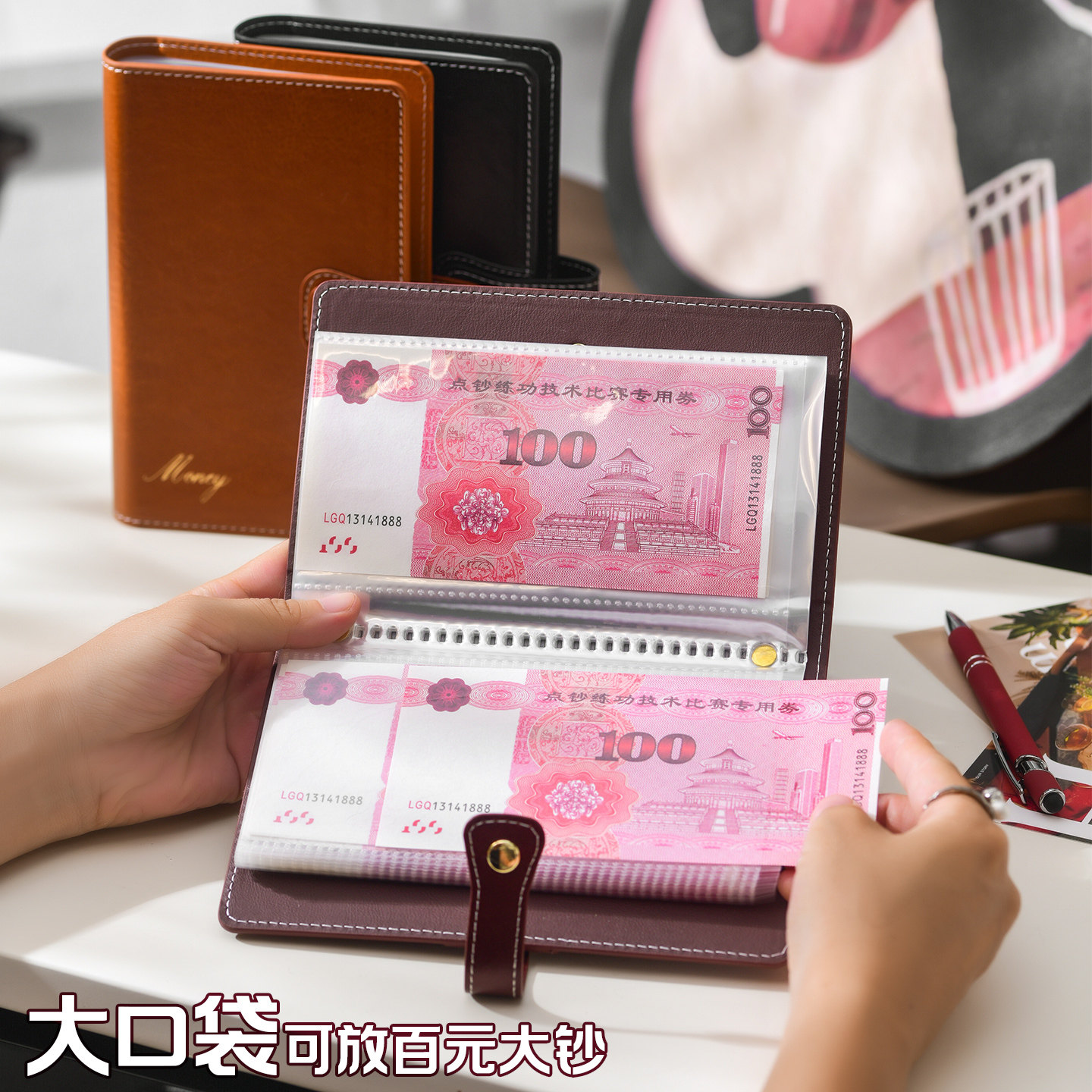 📚 文创艺高档皮质按扣A6存钱本现金理财存钱本钱夹收纳包网红大容量内页收纳袋纸币纪念收藏册零花钱收纳册防水
