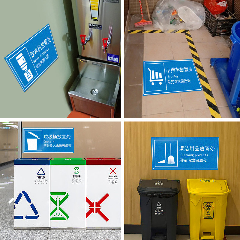 📚 垃圾桶放置处清洁工具推车饮水机放置地面贴纸用品存放处提示贴厂区车间医院区域划分工具材料定制分类标识牌