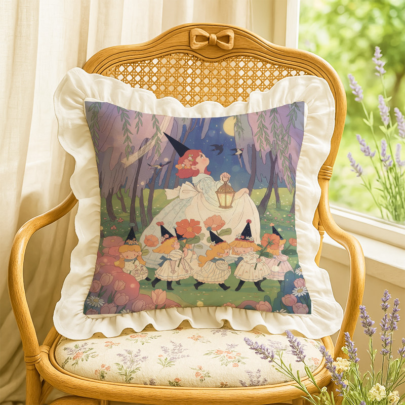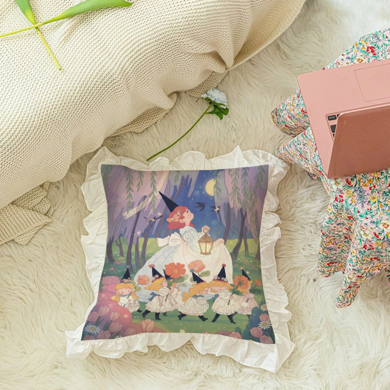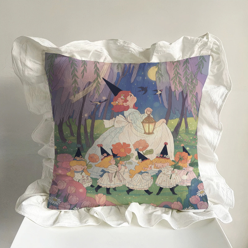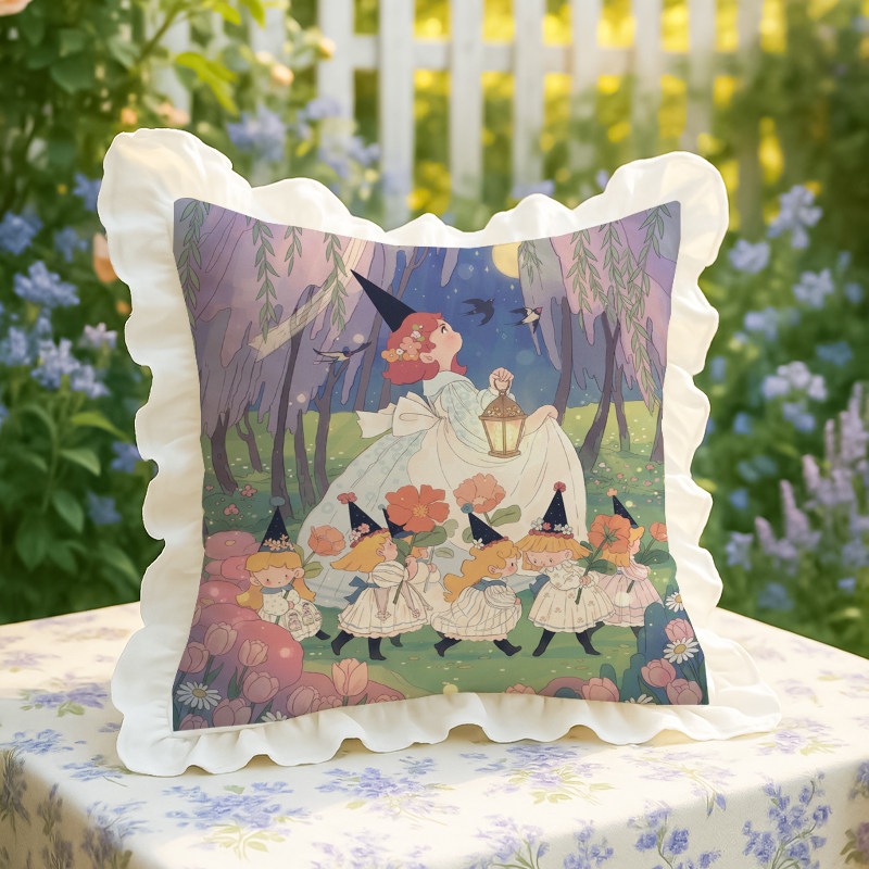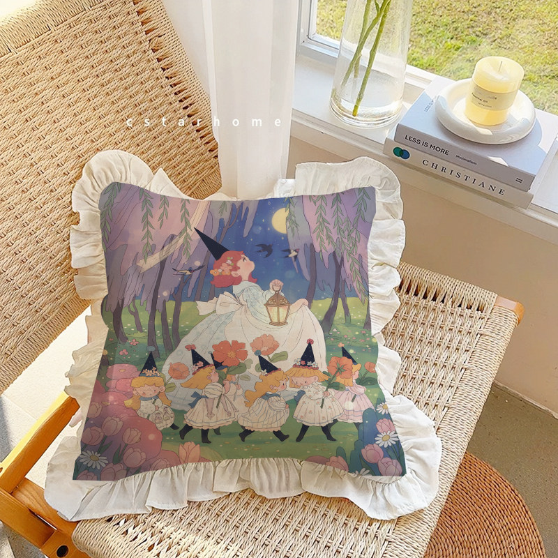 📚 小女巫独创抱枕水洗棉荷叶花边插画沙发靠垫腰枕含芯春日汽车装饰