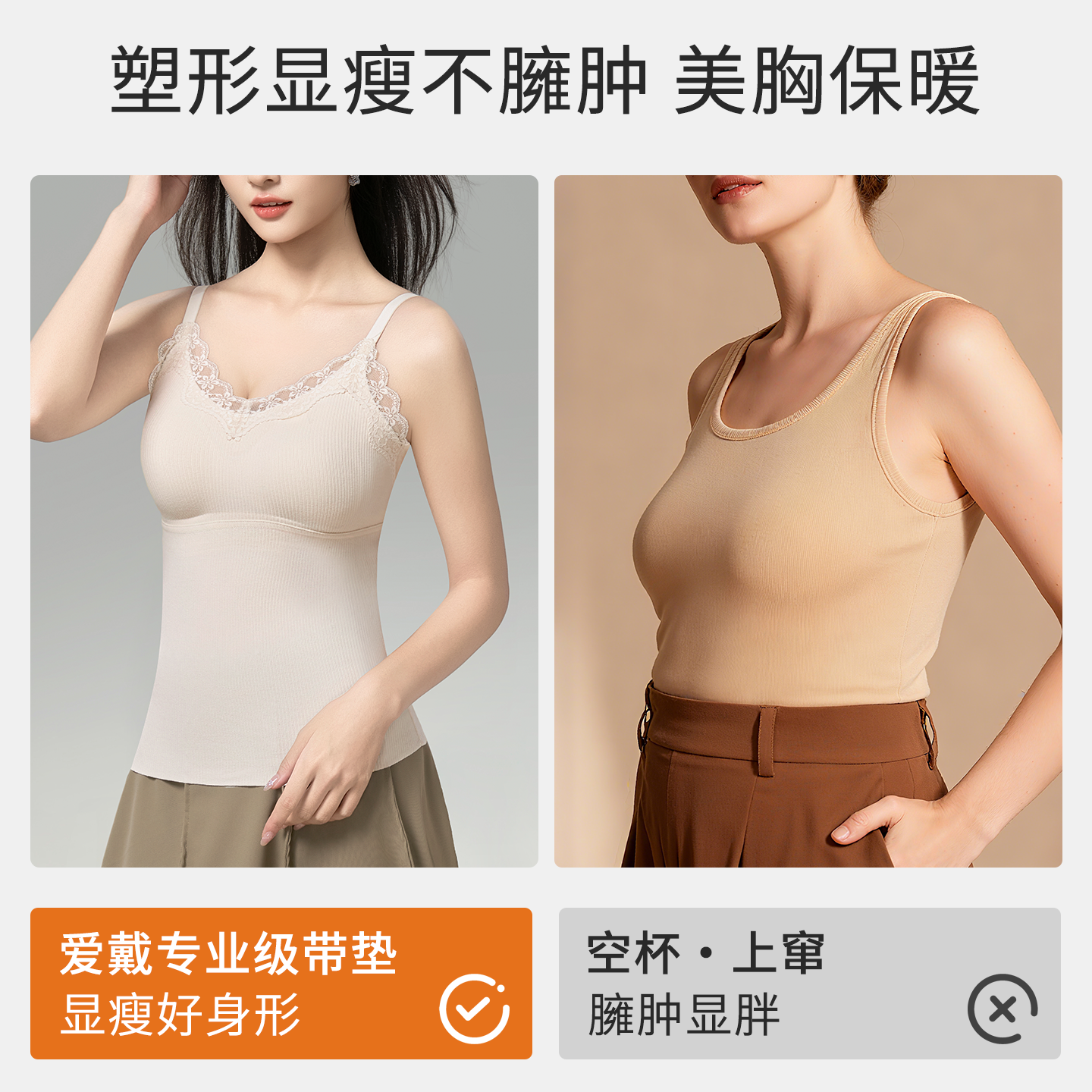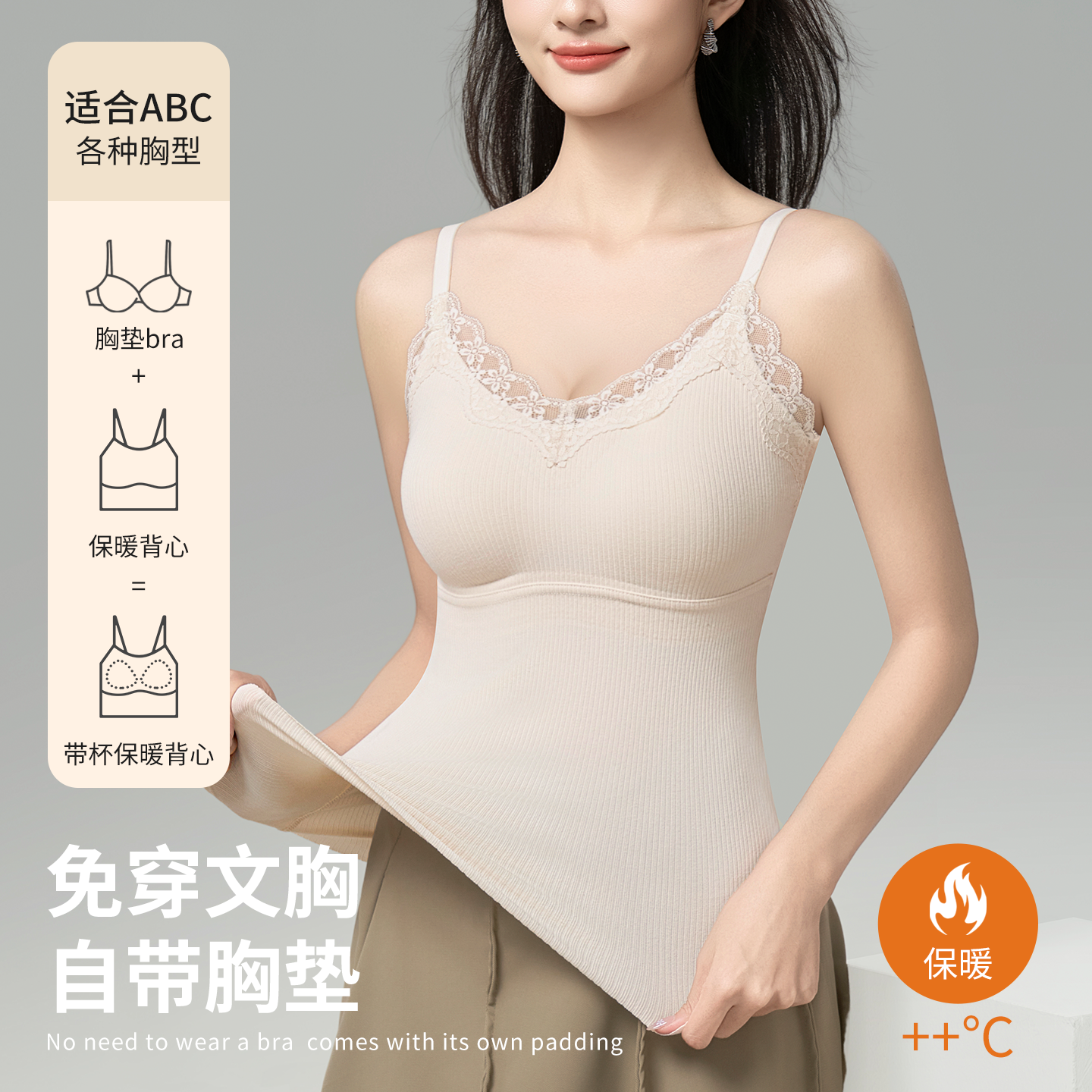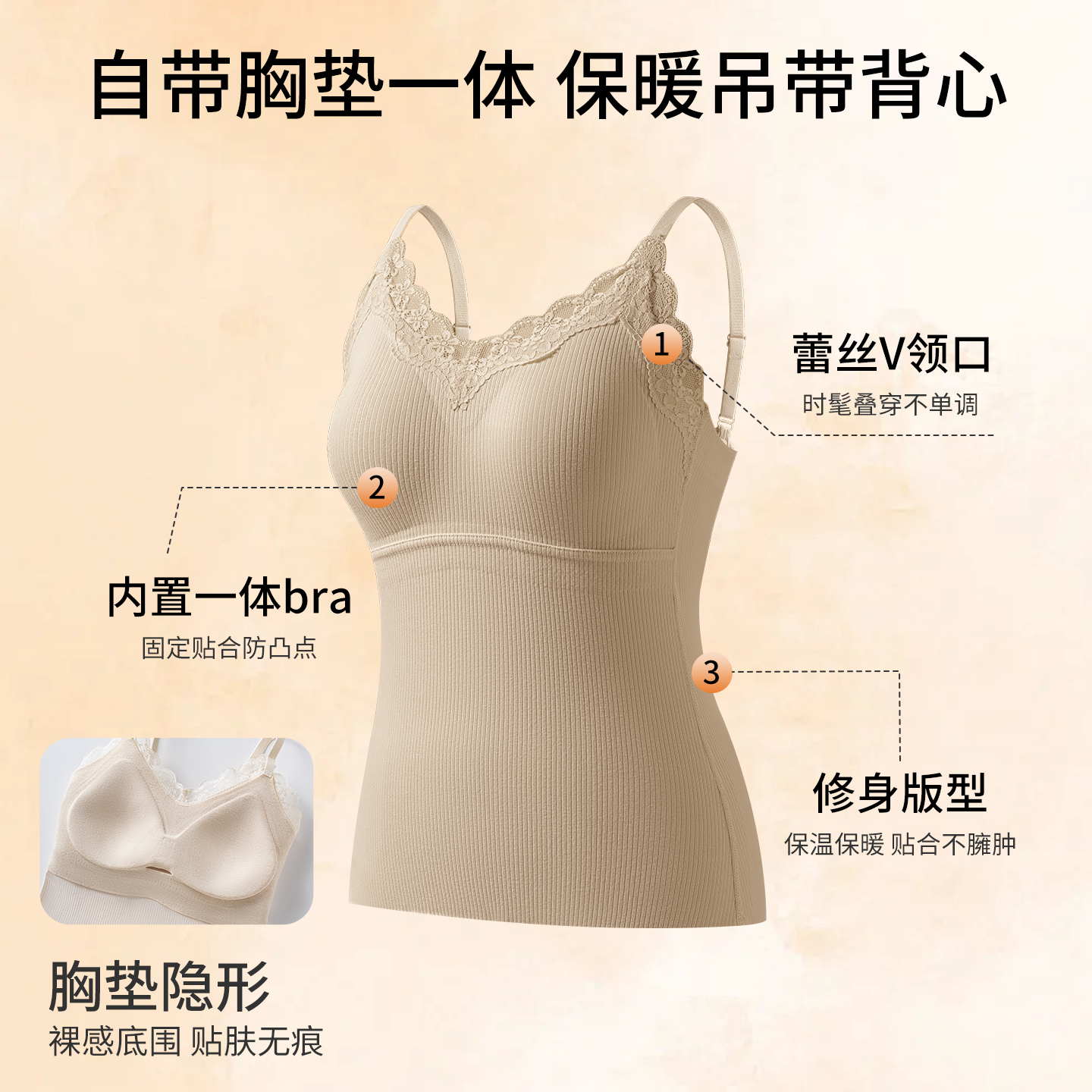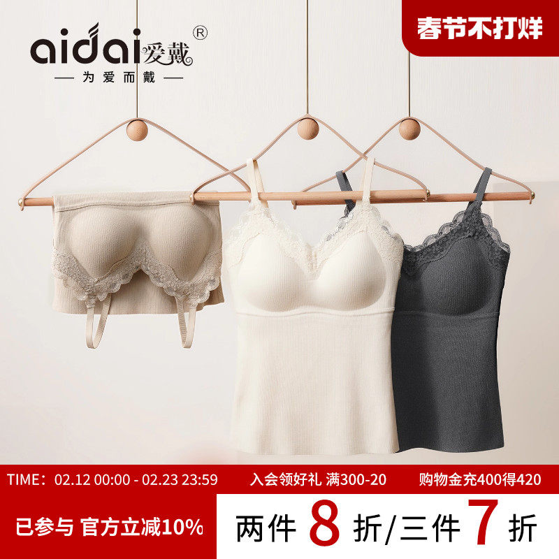 📚 爱戴无痕保暖背心发热羊毛打底蕾丝V领上衣带胸垫免穿文胸一体式