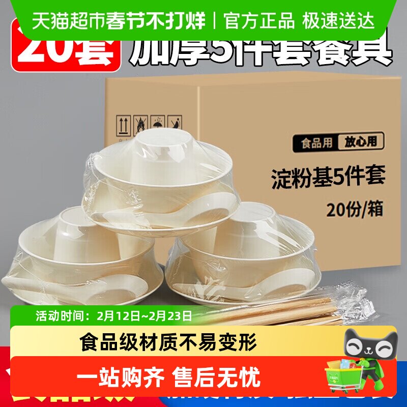 📚 优奥一次性餐具套装20套(碗杯子盘子勺子筷子五件套淀粉基免洗