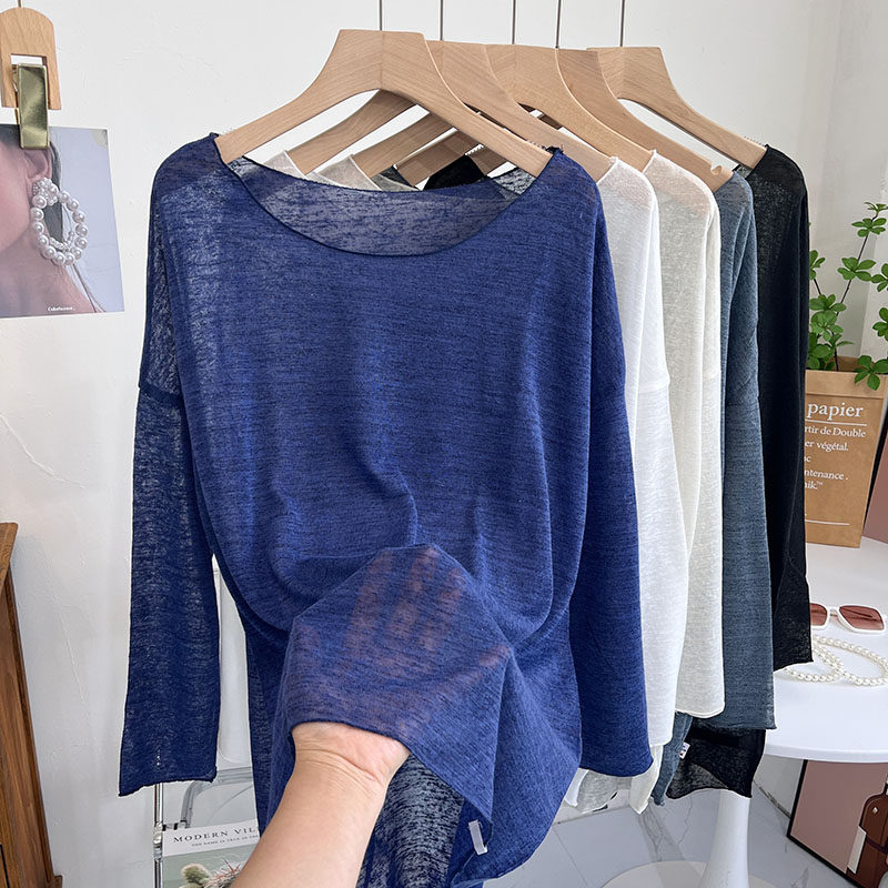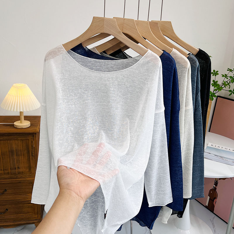 📚 大圆领透视T恤防晒衣女夏季超薄针织罩衫宽松网纱舞蹈服上衣长袖