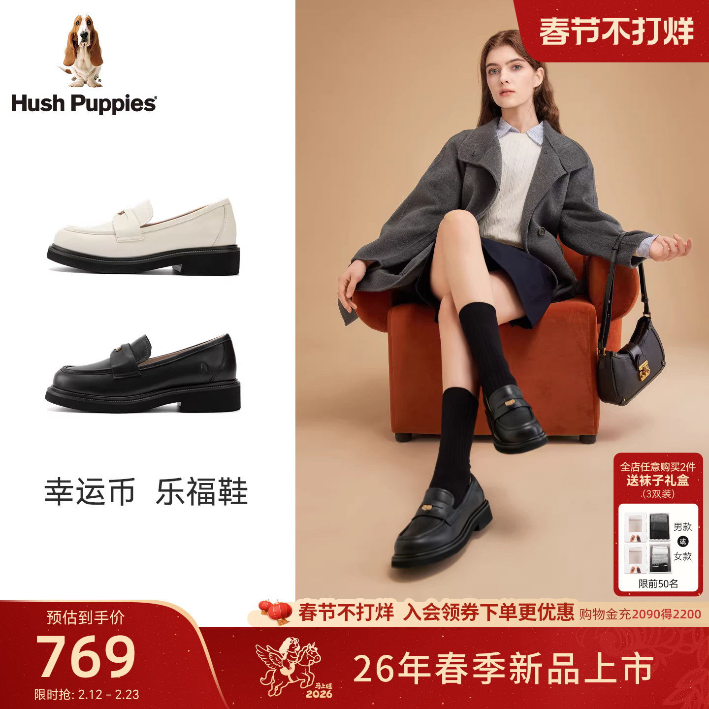 📚 暇步士幸运币乐福鞋女2026春新款黑皮鞋厚底真皮英伦风增高休闲鞋