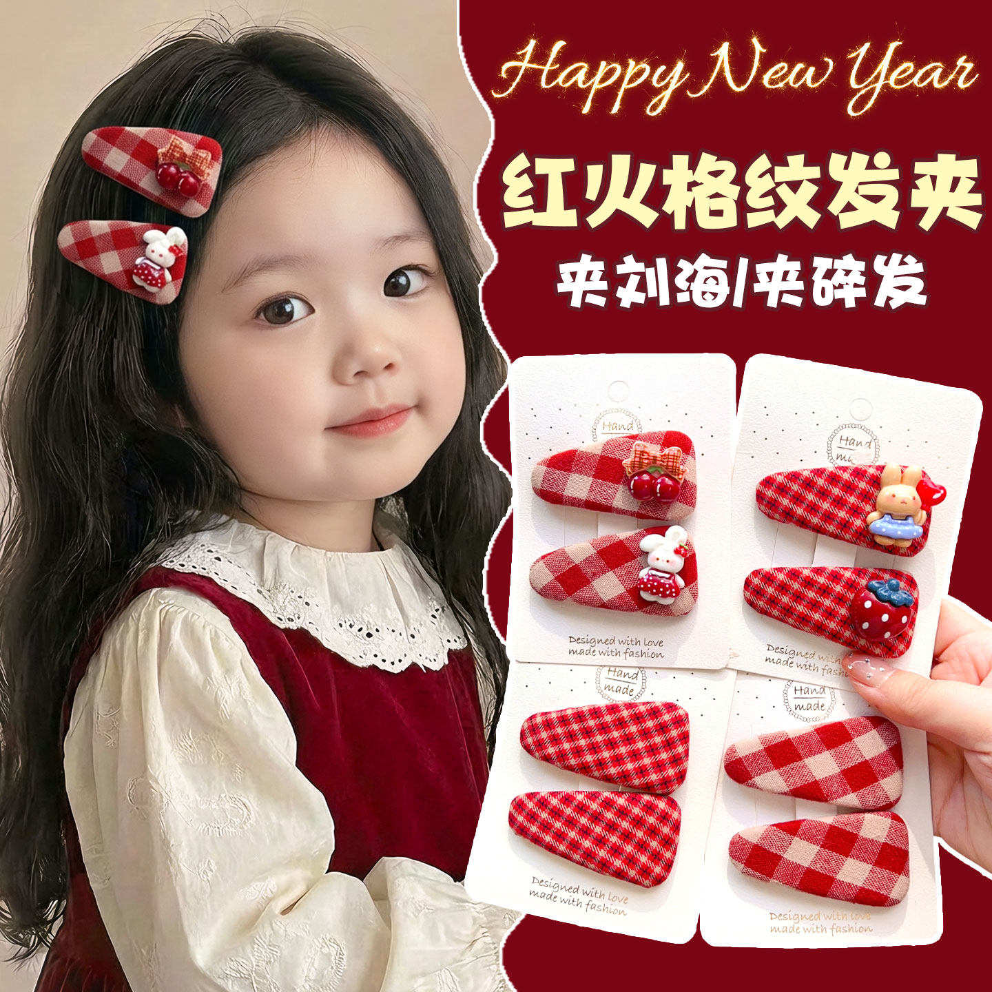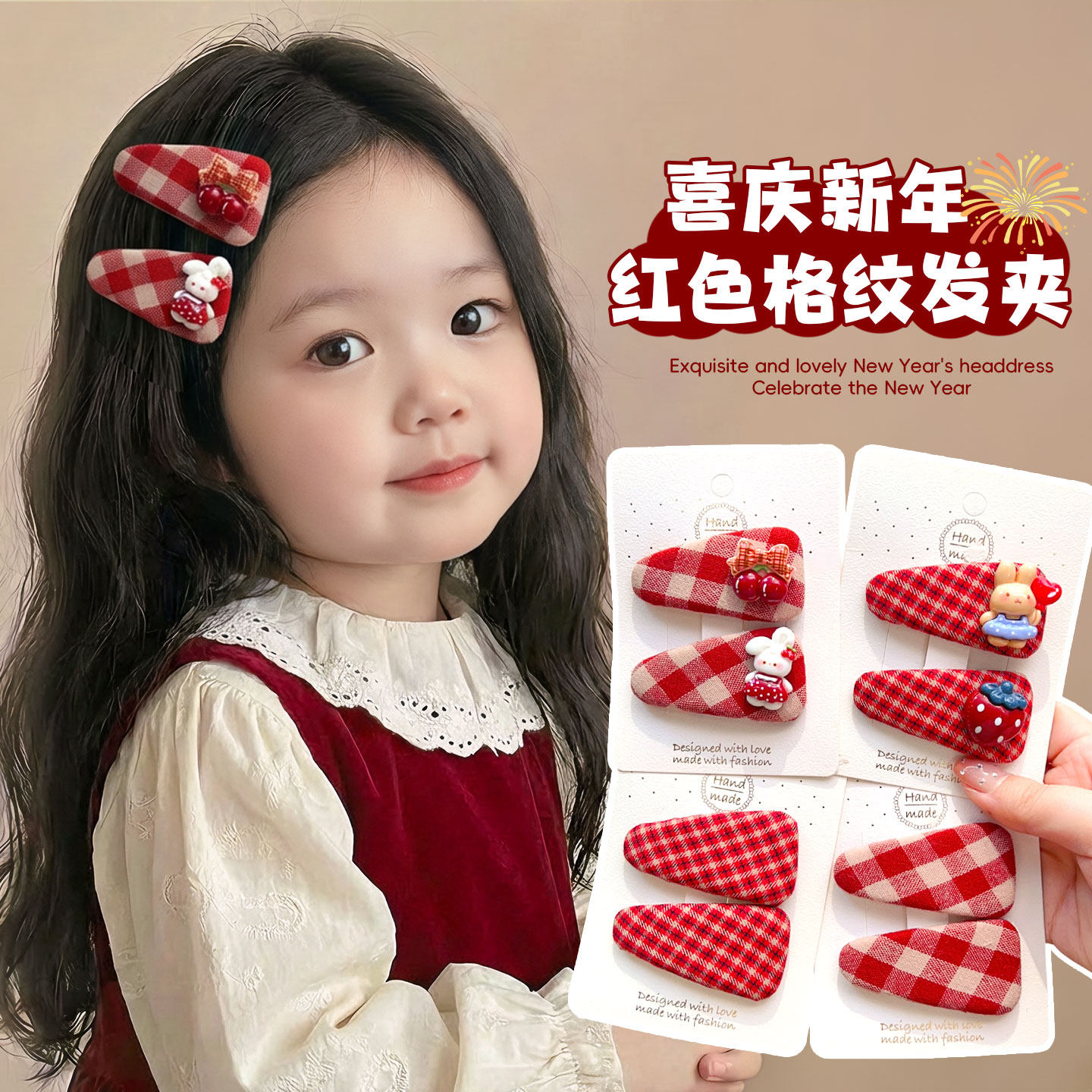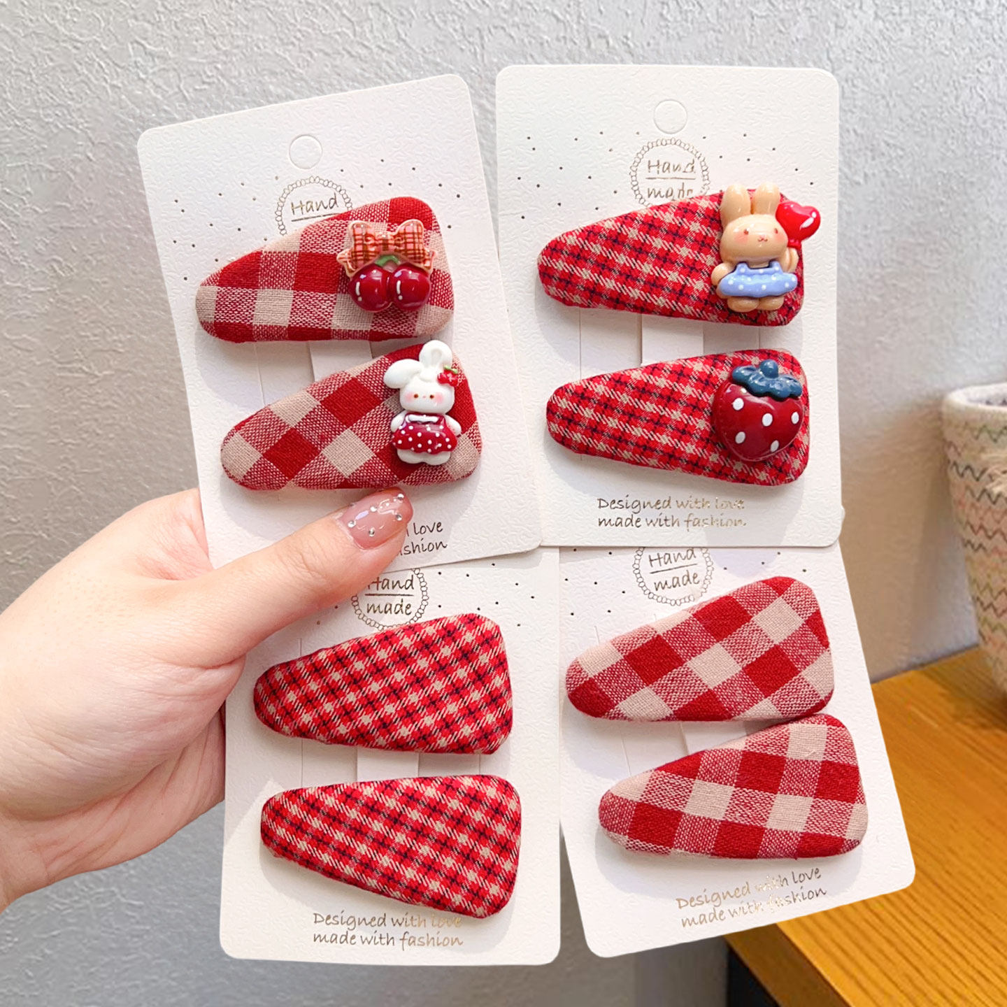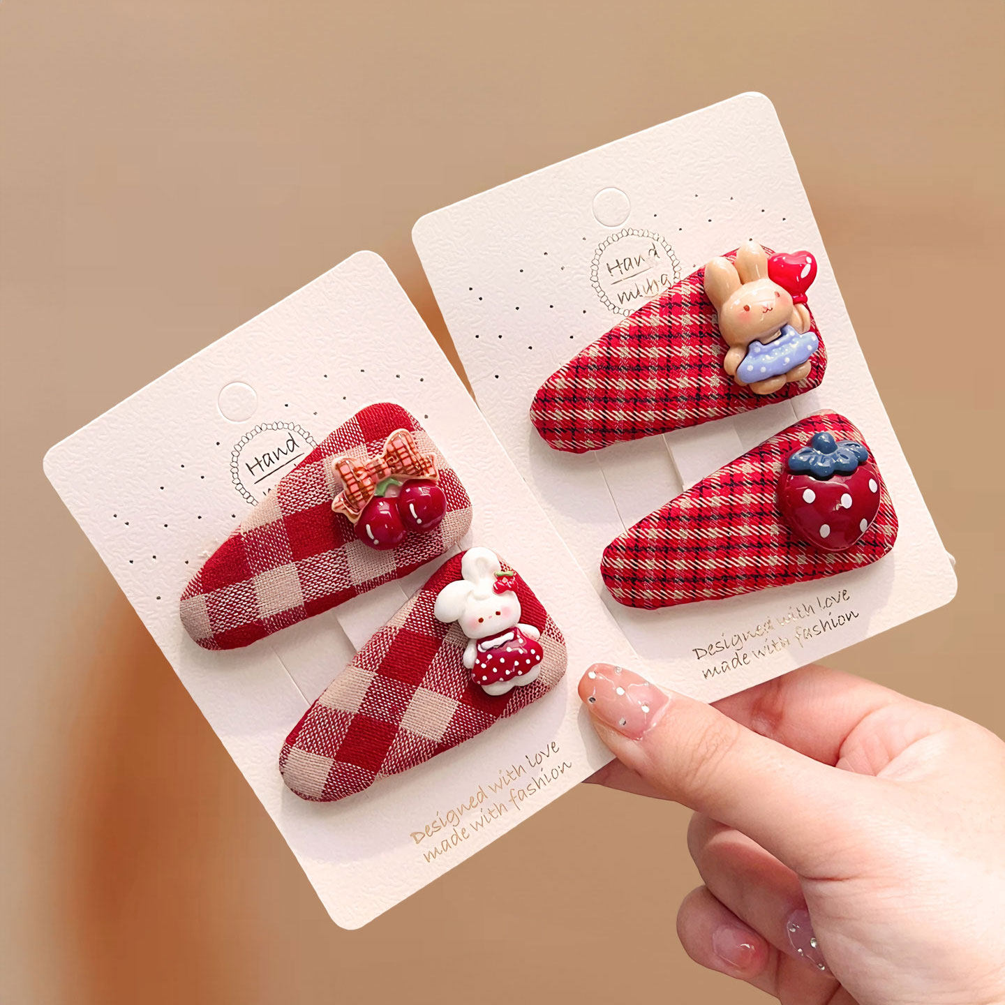 📚 红色格子布艺发夹女童可爱卡通兔子樱桃三角形发卡子女孩bb夹头饰