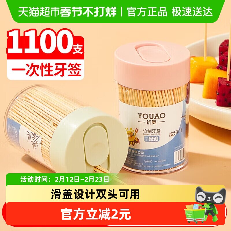 📚 优奥一次性双头竹牙签水果签小吃签罐装剔牙签竹签550支*2桶