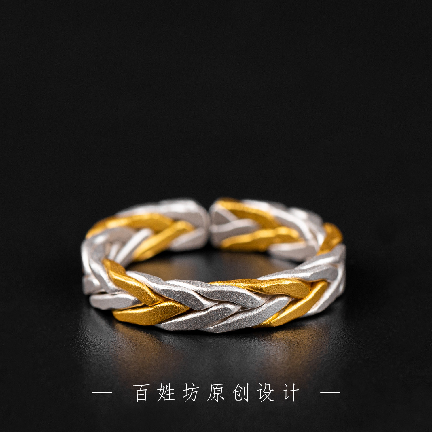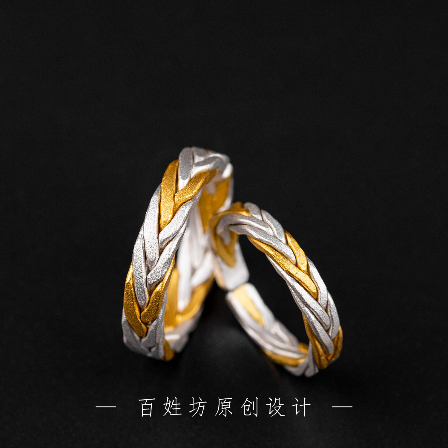 📚 新款999纯银手工编织男女戒指24K金包银情侣对戒一对麻花开口指环