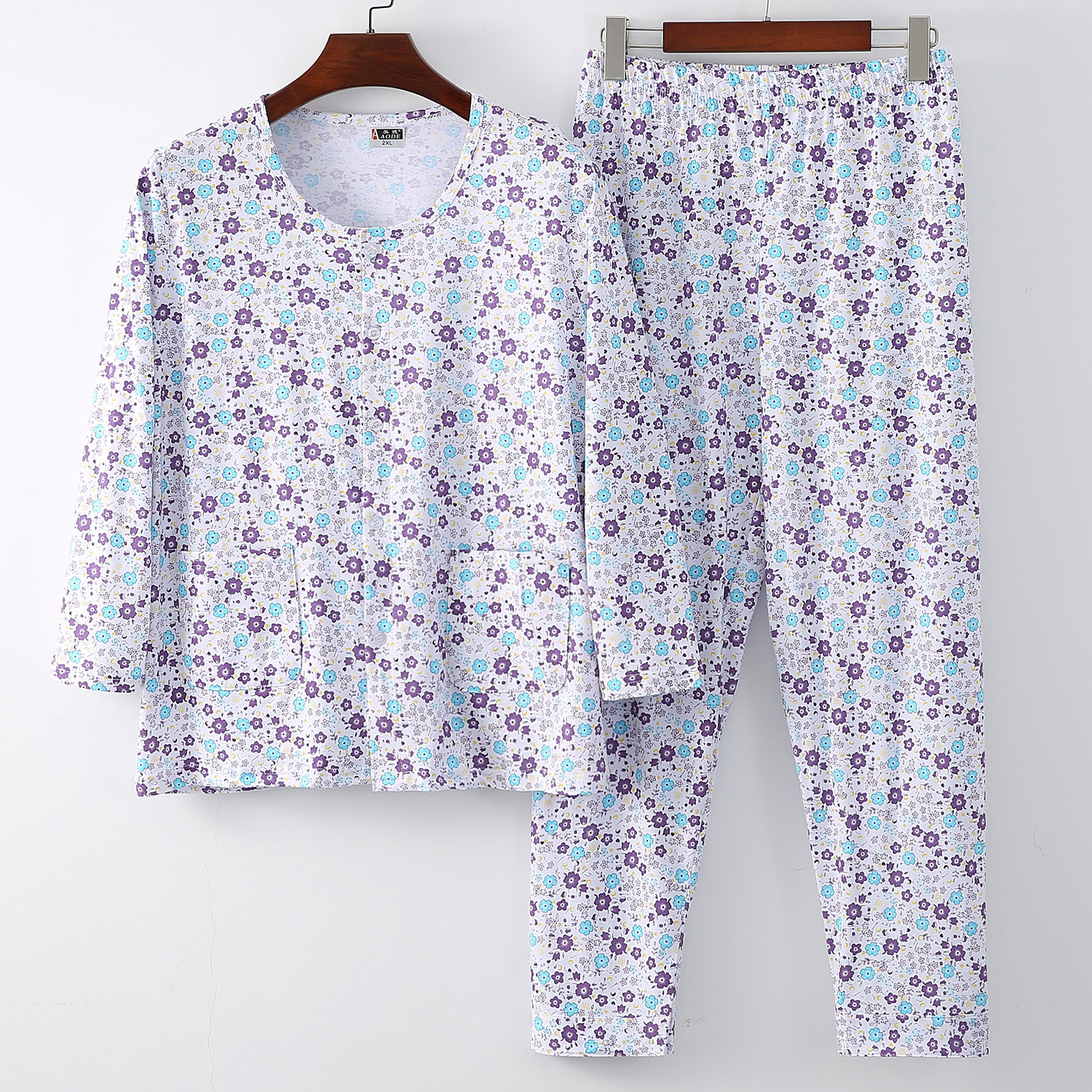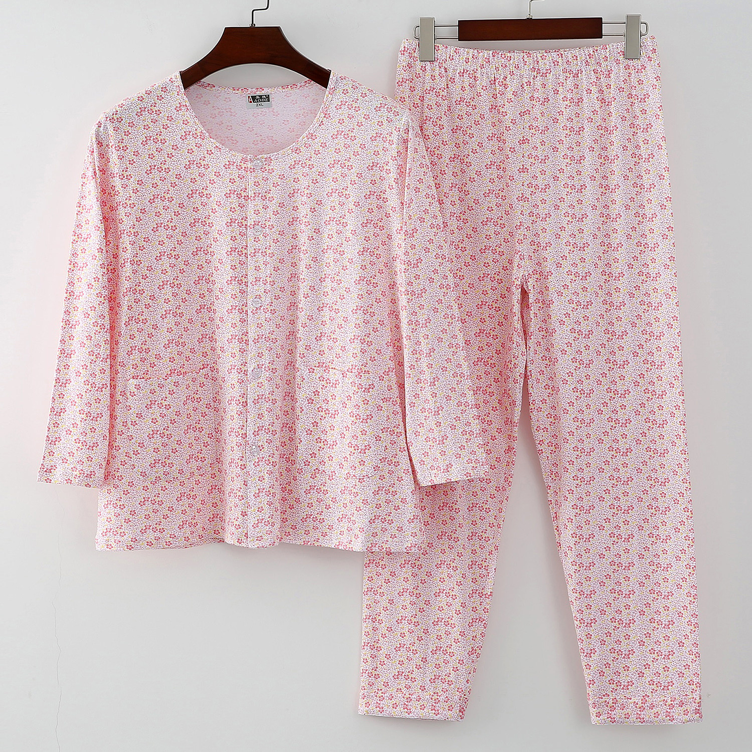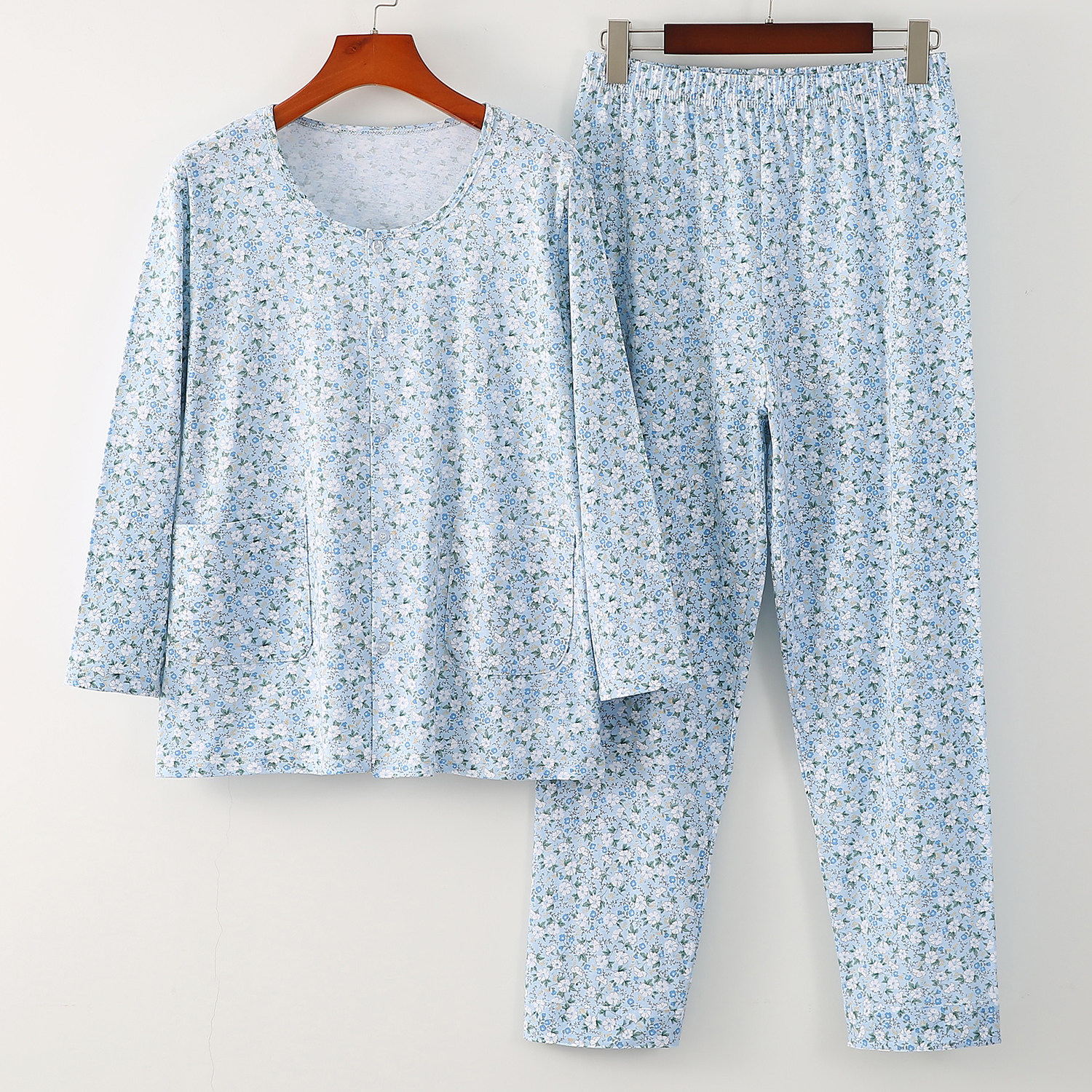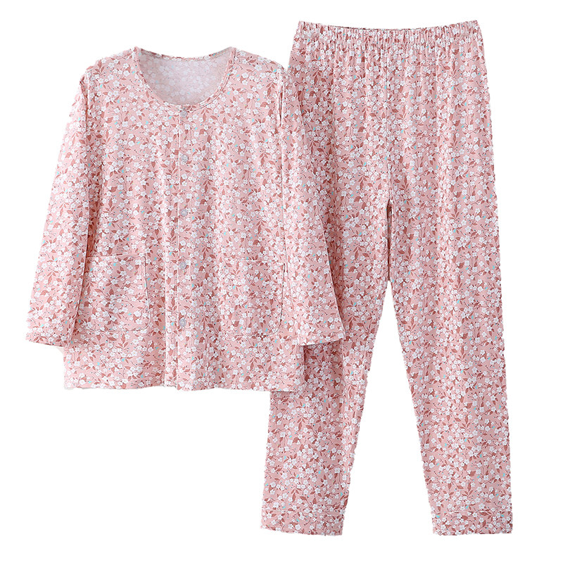 📚 中老年女纯棉睡衣睡裤老人薄款全棉圆领开衫高腰休闲家居空调套服