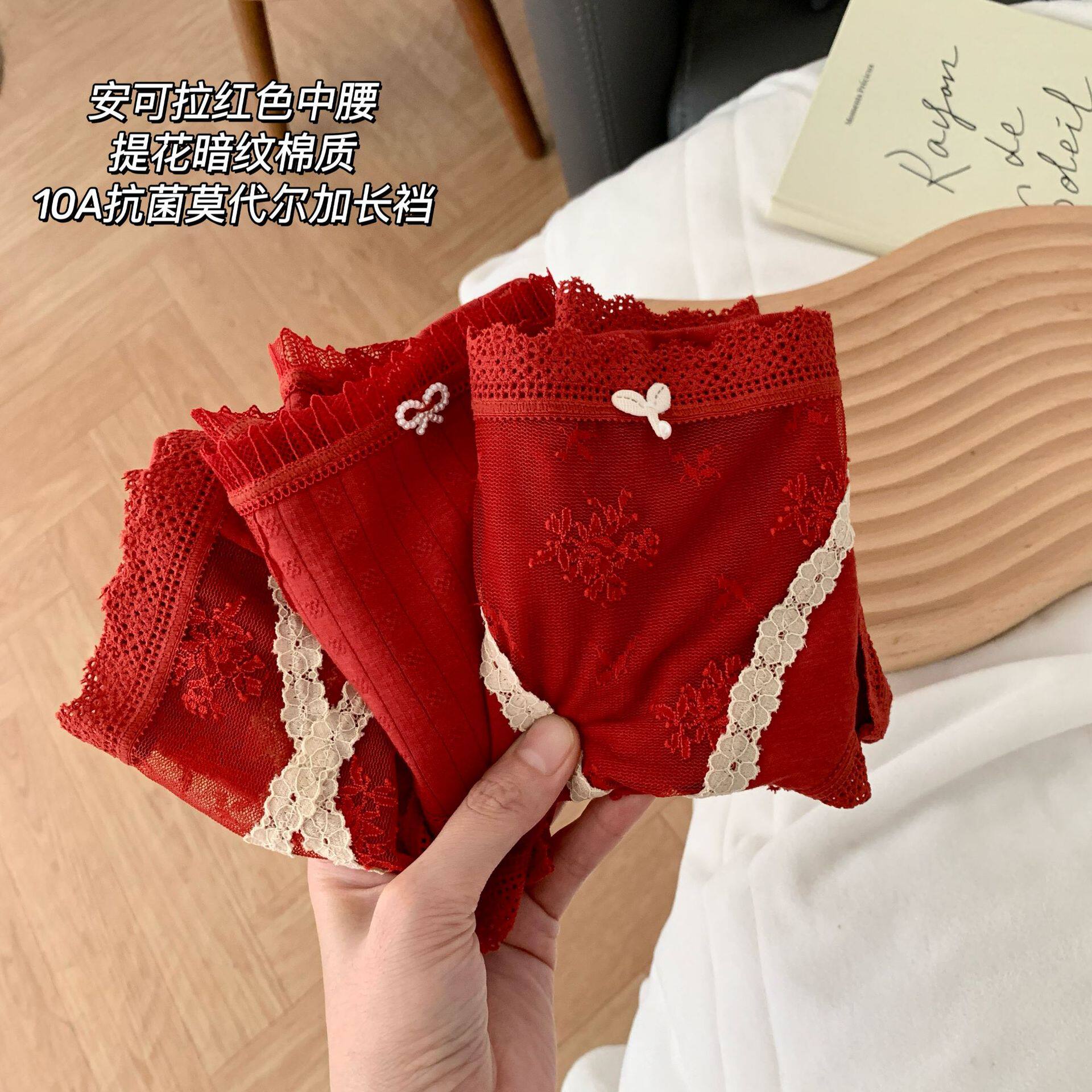 📚 2条装中式轻奢暗纹本命年结婚红色内裤女士三角裤头中腰莫代尔棉
