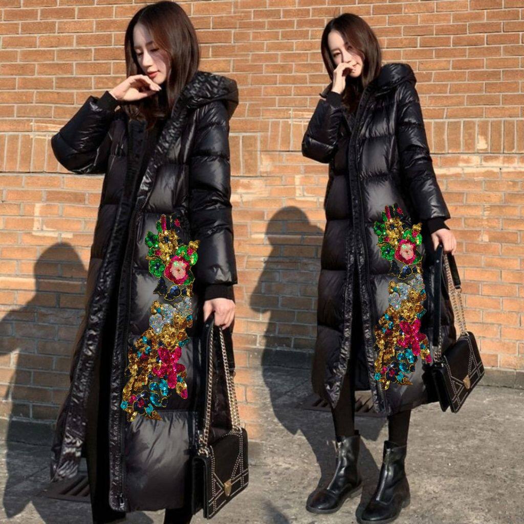 📚 钻花长款羽绒棉衣黑色棉服2025亮面韩版新款过膝宽松加厚棉袄外套
