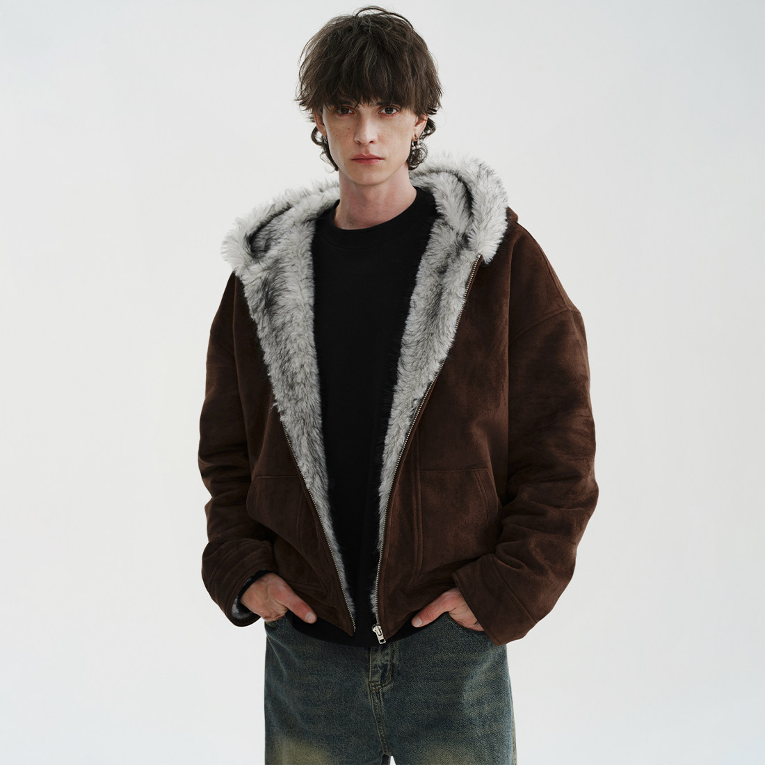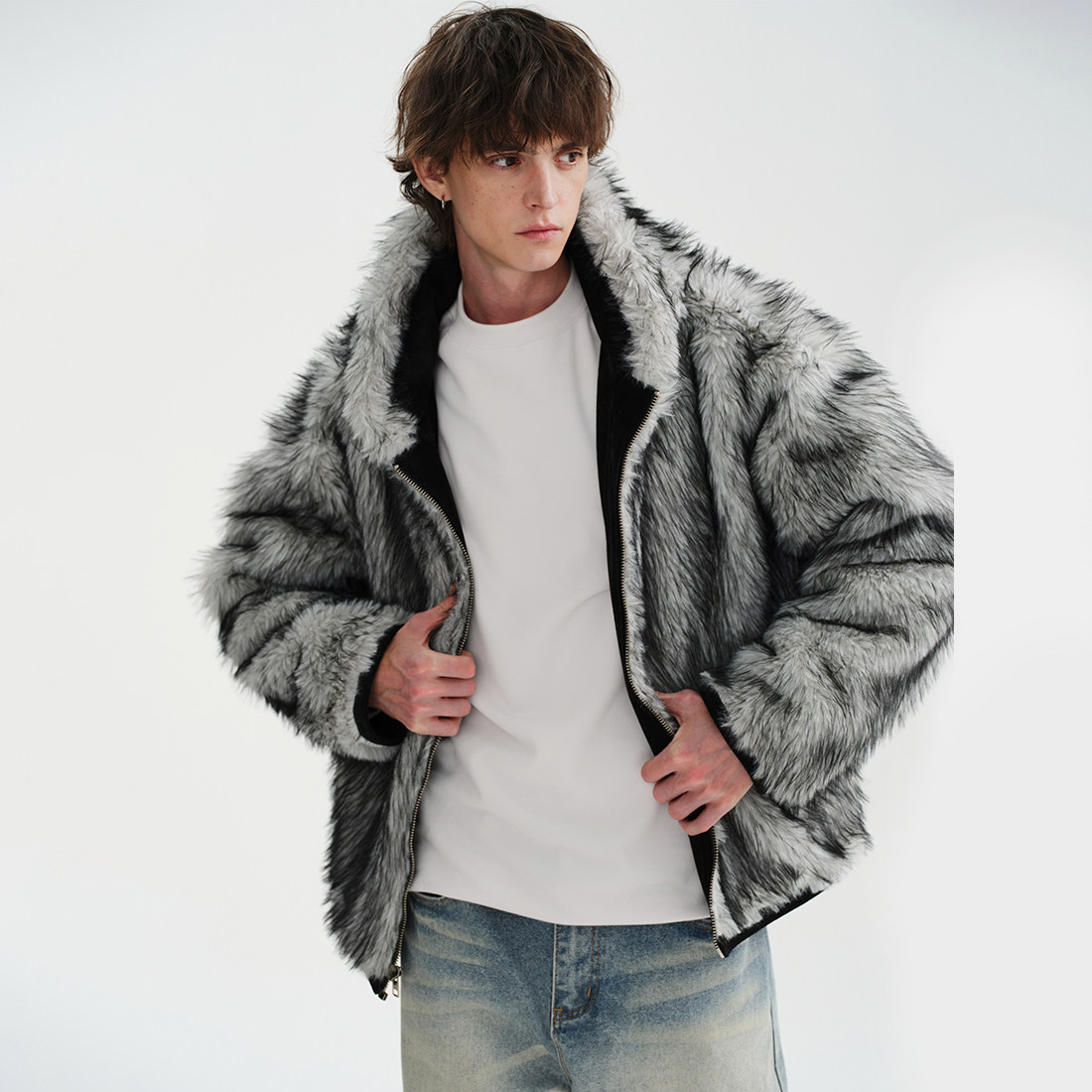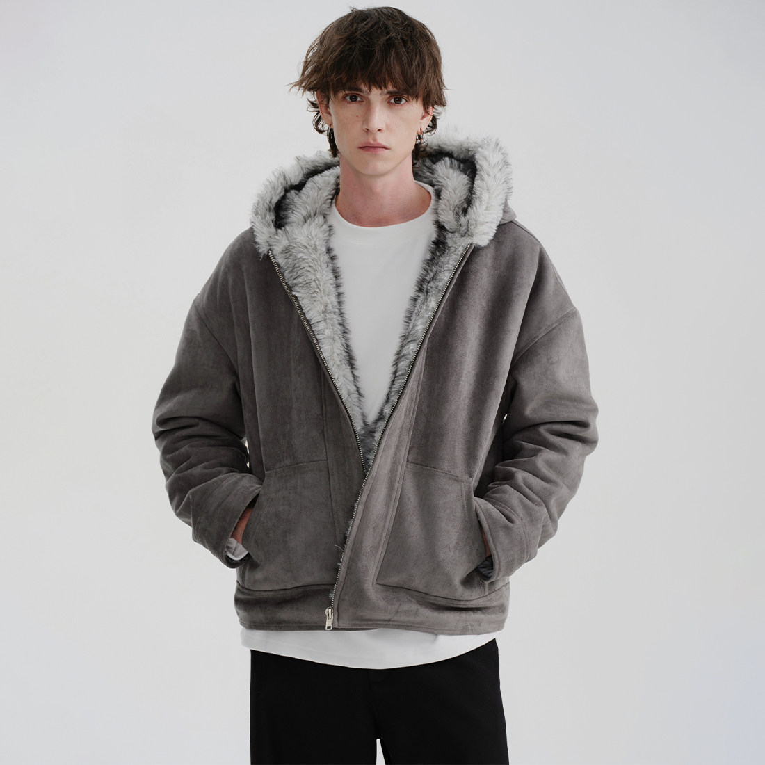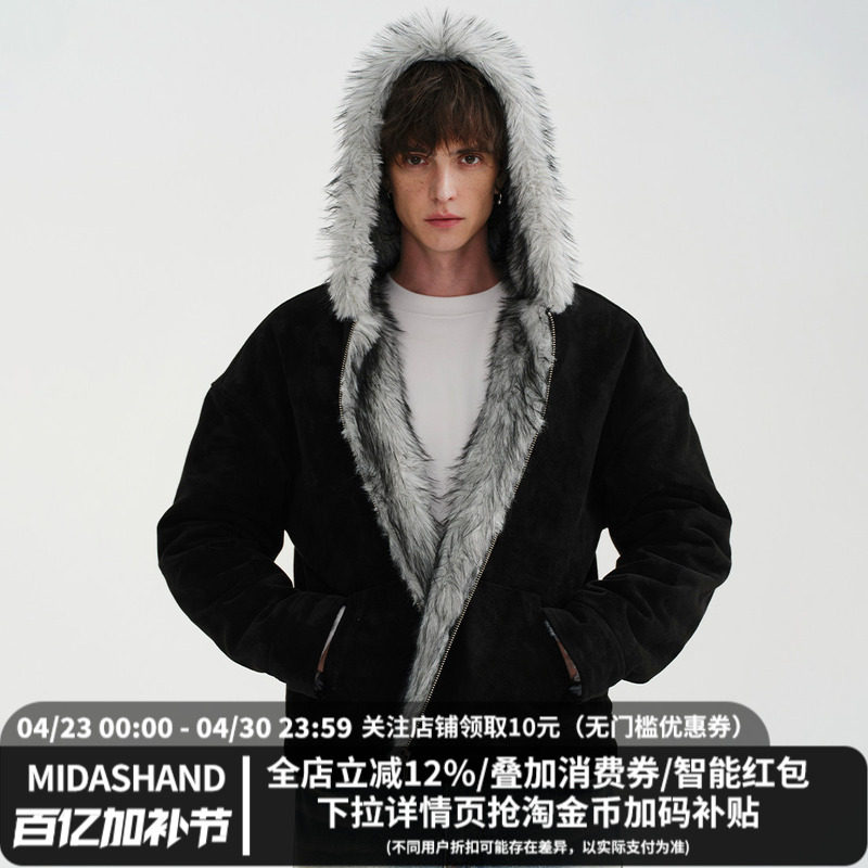 📚 MIDASHAND 25aw狼王座山雕纯色仿狼毛夹克正反两穿连帽皮草外套男