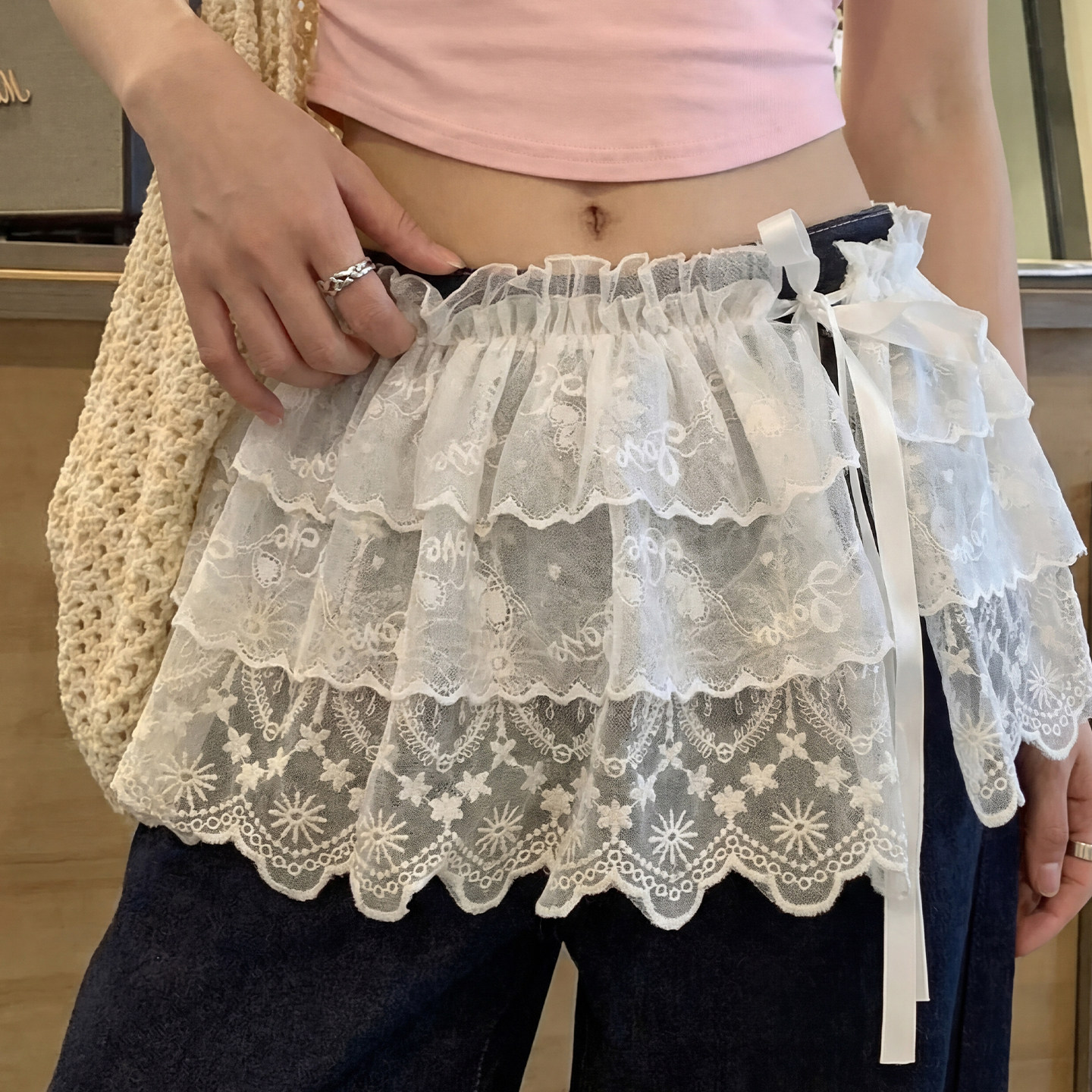 📚 白色蕾丝花边屁帘女高级感韩系ins风牛仔裤叠穿半身裙蛋糕裙短裙