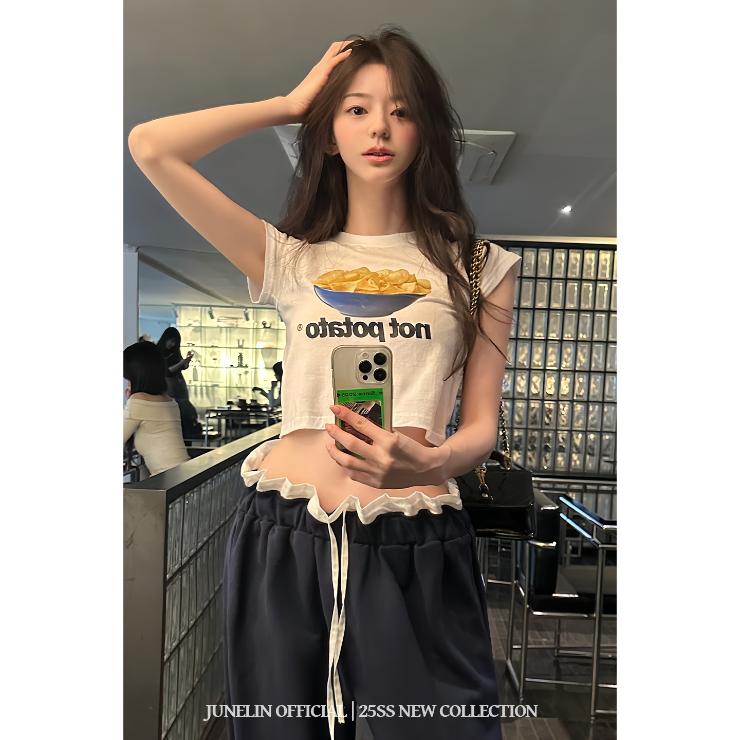 📚 六月林 韩国博主同款薯片印花露脐短款上衣女设计感撞色花边长裤