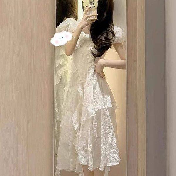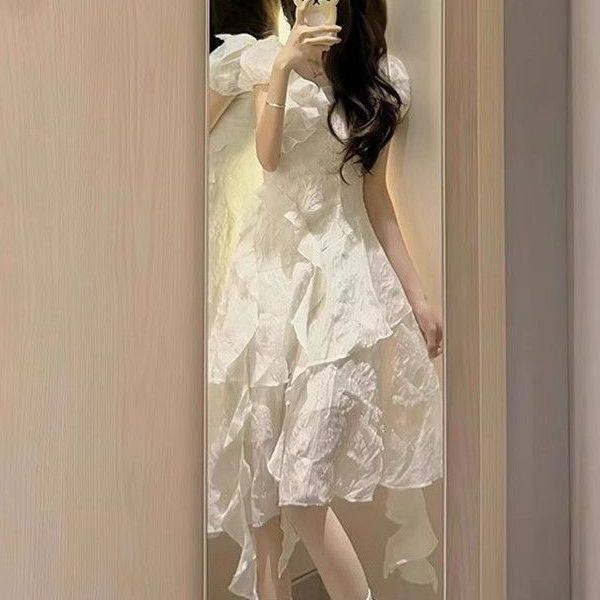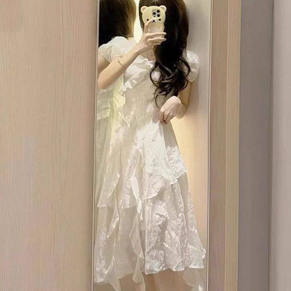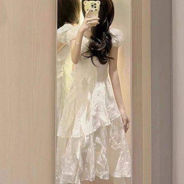 📚 仙女风梦游爱丽丝白色法式茶歇连衣裙甜辣荷叶边不规则显瘦短裙子