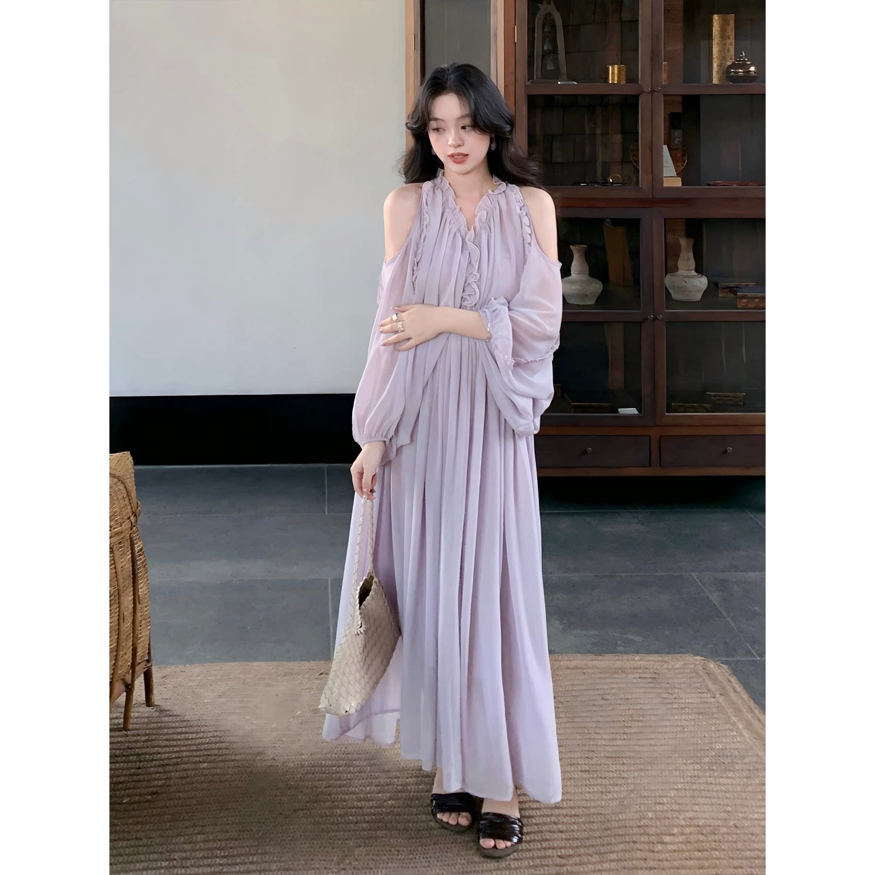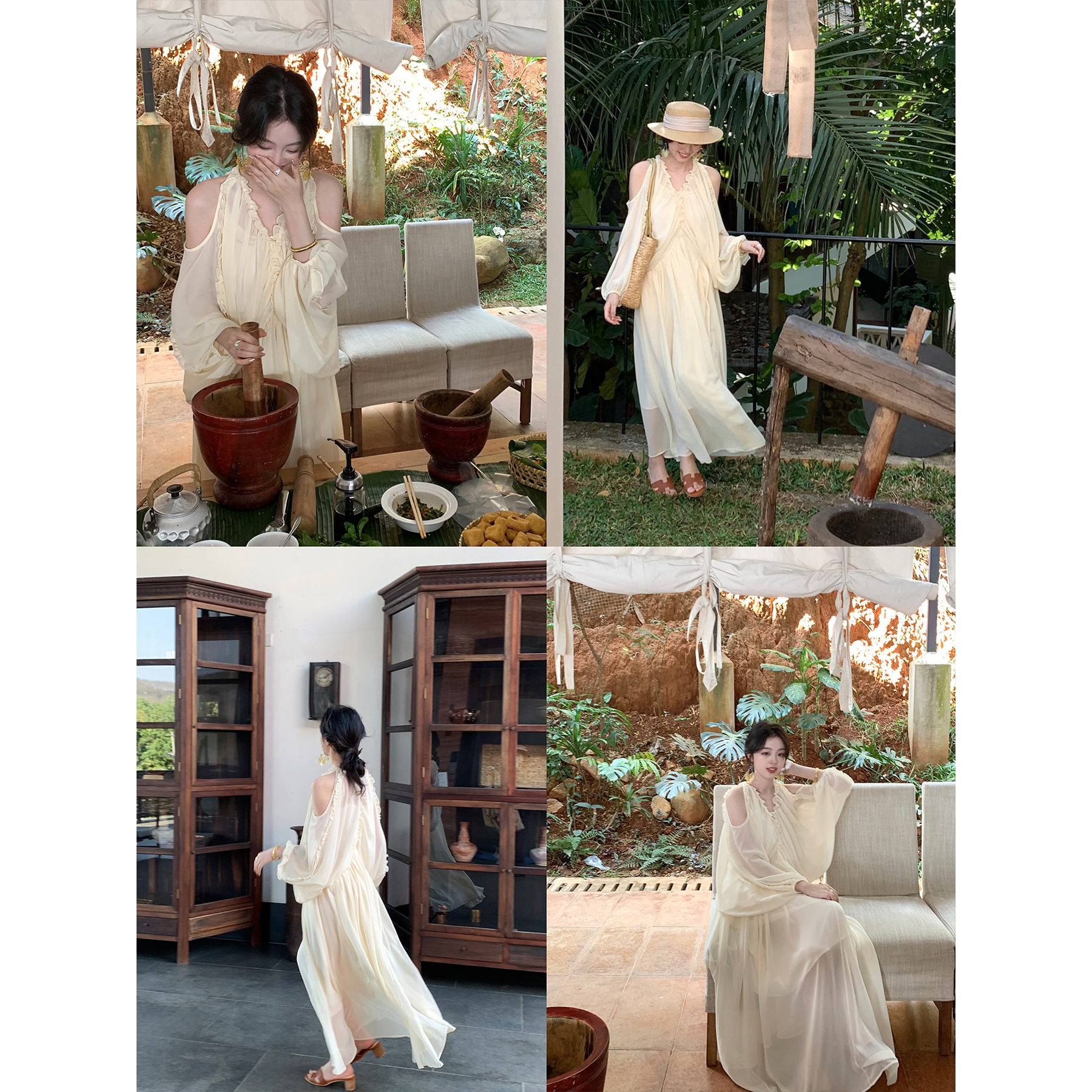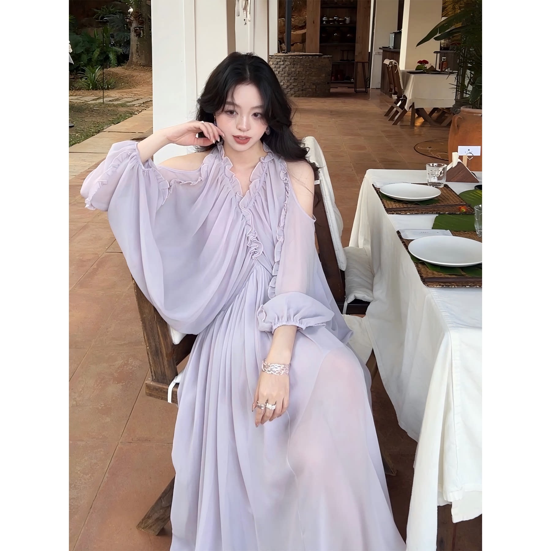 📚 【水云间】SYT自制 度假风露肩木耳边V领仙气飘飘蝙蝠袖连衣裙女