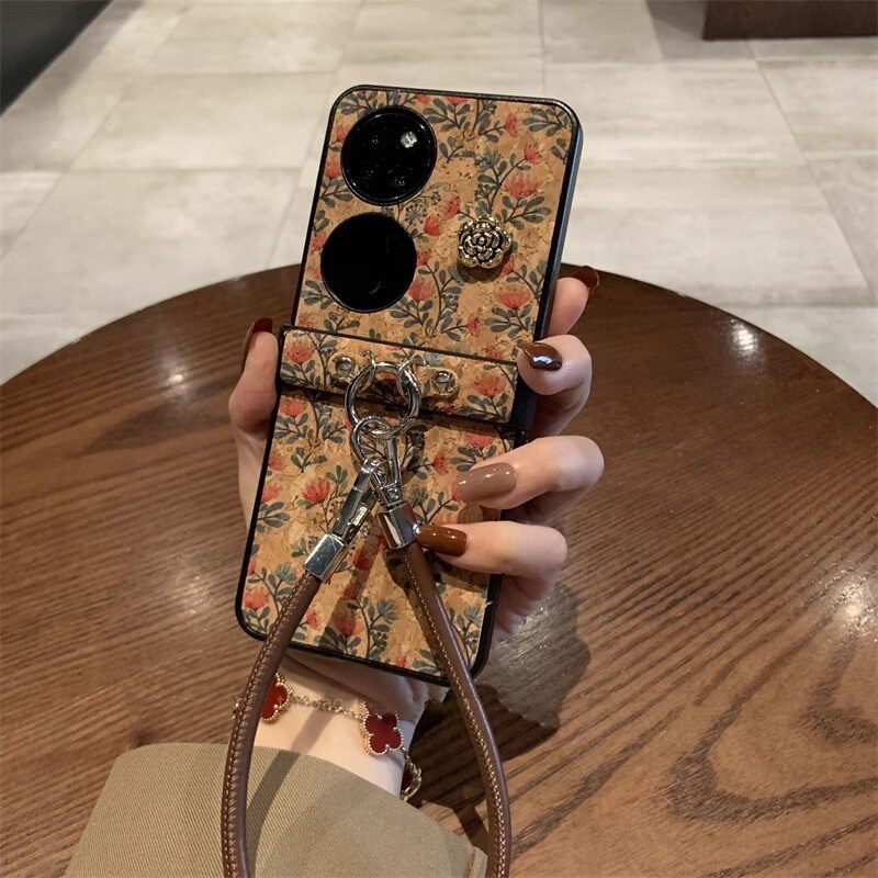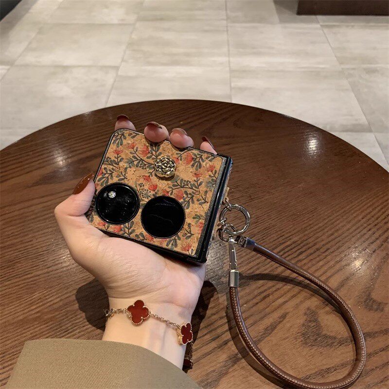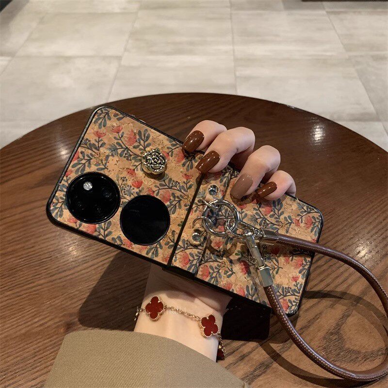 📚 复古棕皮纹小红花山茶花手提链适用华为pocket2手机壳zflip6秋冬新款novaflip折叠屏宝盒mixflip高档创意女款