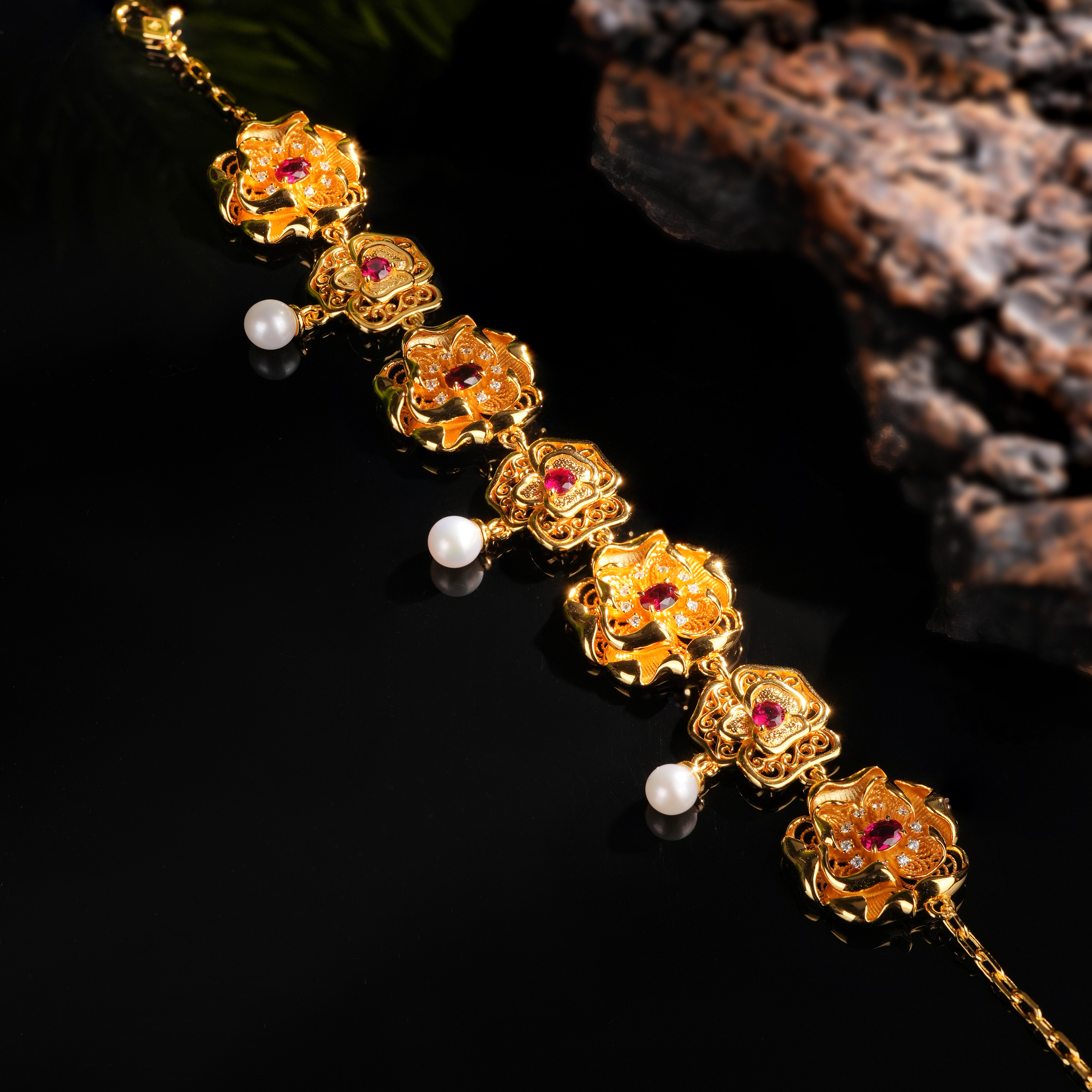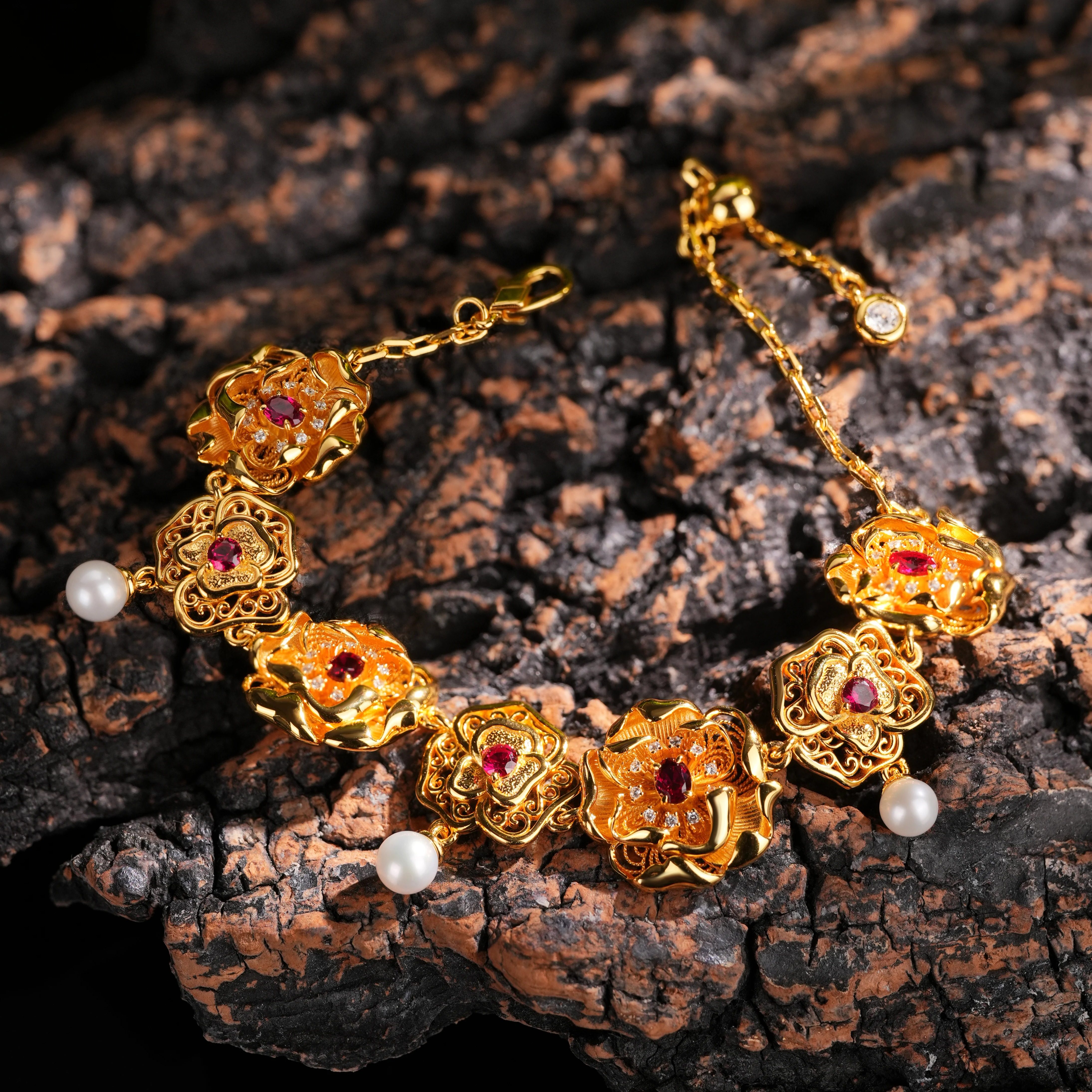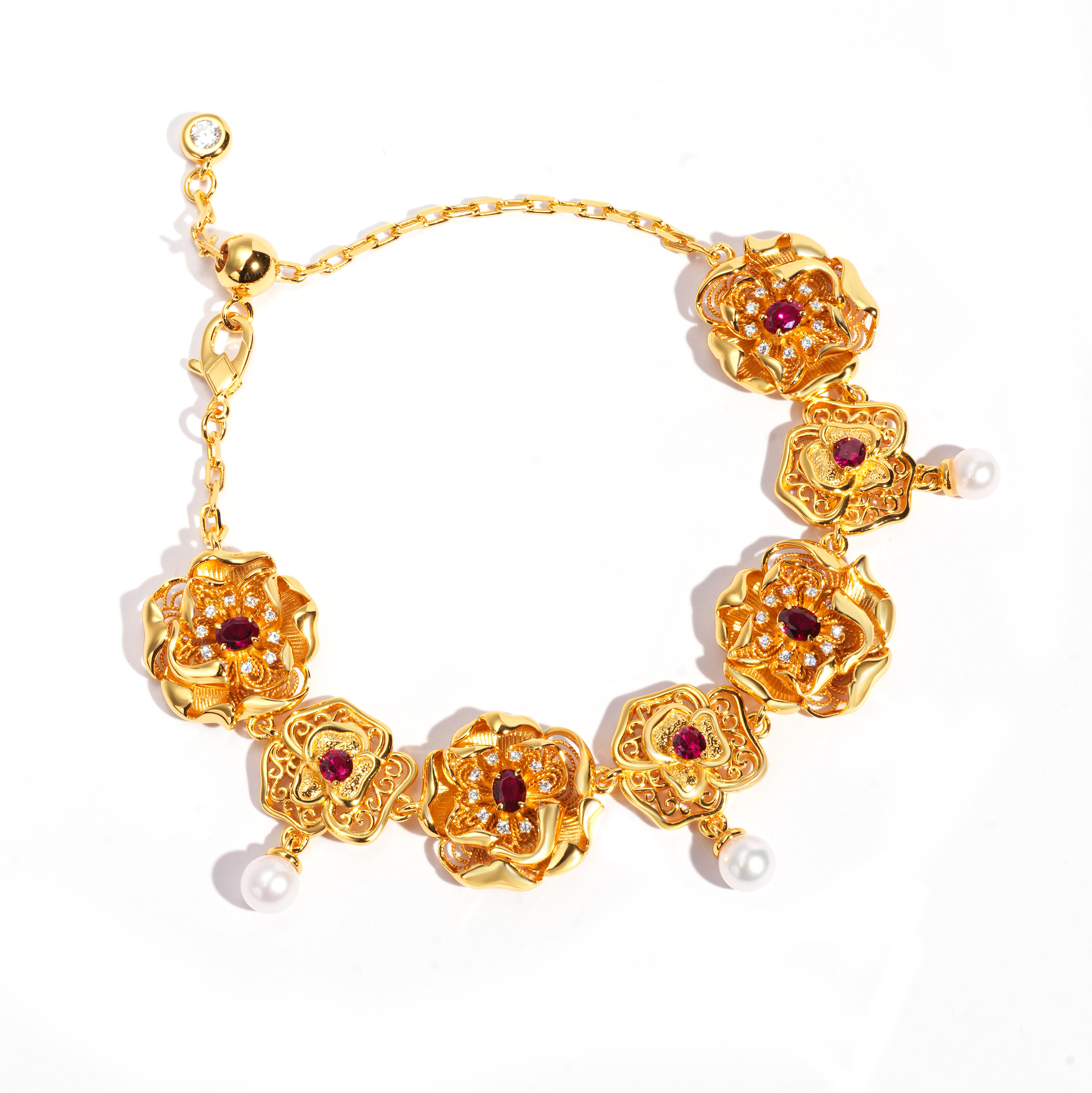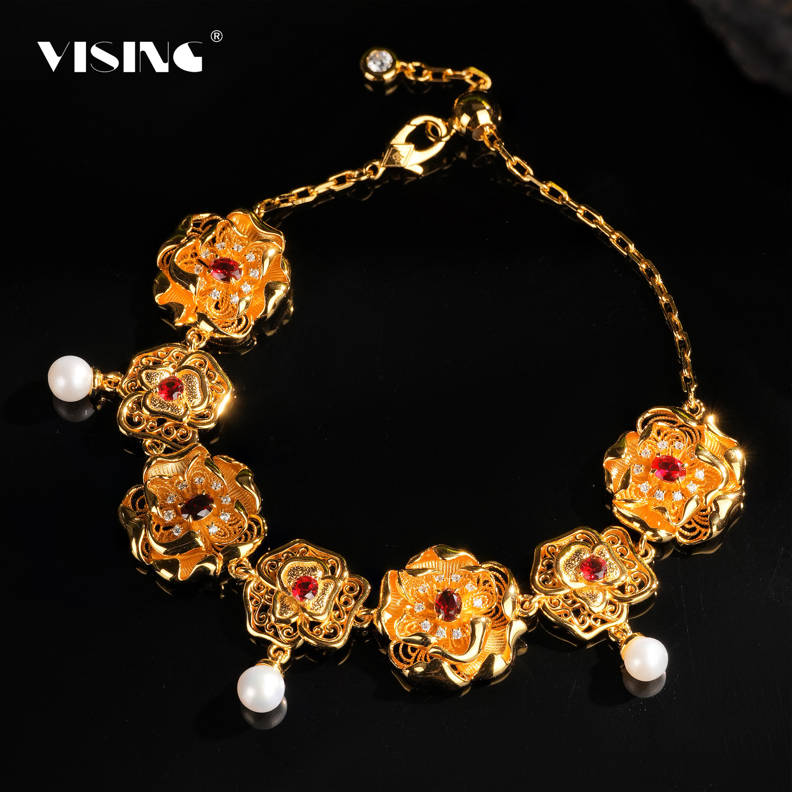 📚 VISING培育红宝石【国检证书】鸽血红黄金色花朵珍珠手链手串S925