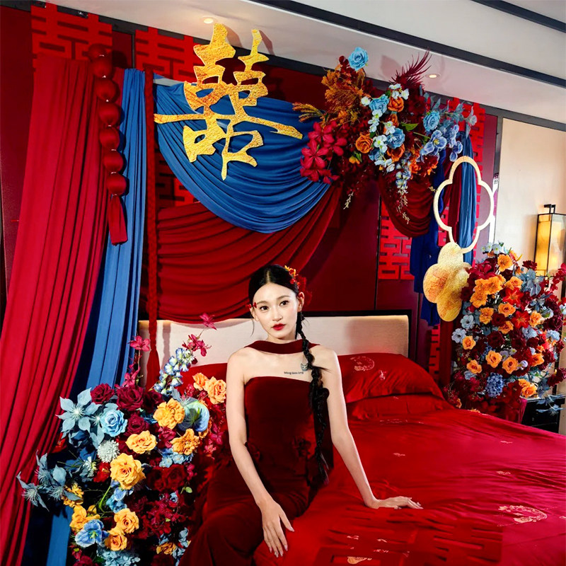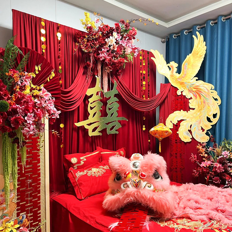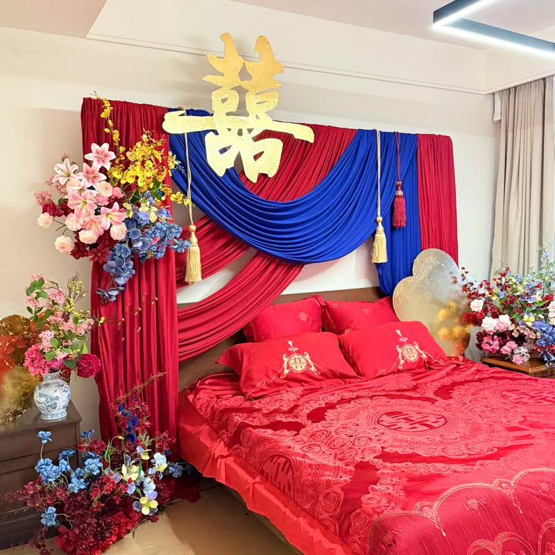 👗在床头,还有一系列精心挑选的喜字装饰,不仅增添了浓厚的喜庆气氛,还让整个房间更加有特色。红色布幔和喜字的搭配,不仅美观,还寓意着对新生活的美好祝愿。