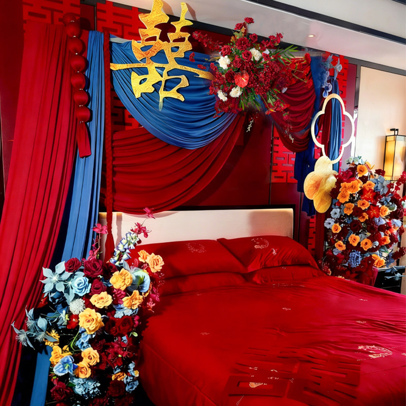 🏮在这款婚房布置中,女方结婚出嫁卧室的床头红色布幔背景让人眼前一亮,仿佛置身于一个充满喜庆和浪漫的氛围之中。整个背景色彩热烈,给人一种红红火火的感觉,仿佛新娘即将步入新的人生阶段。