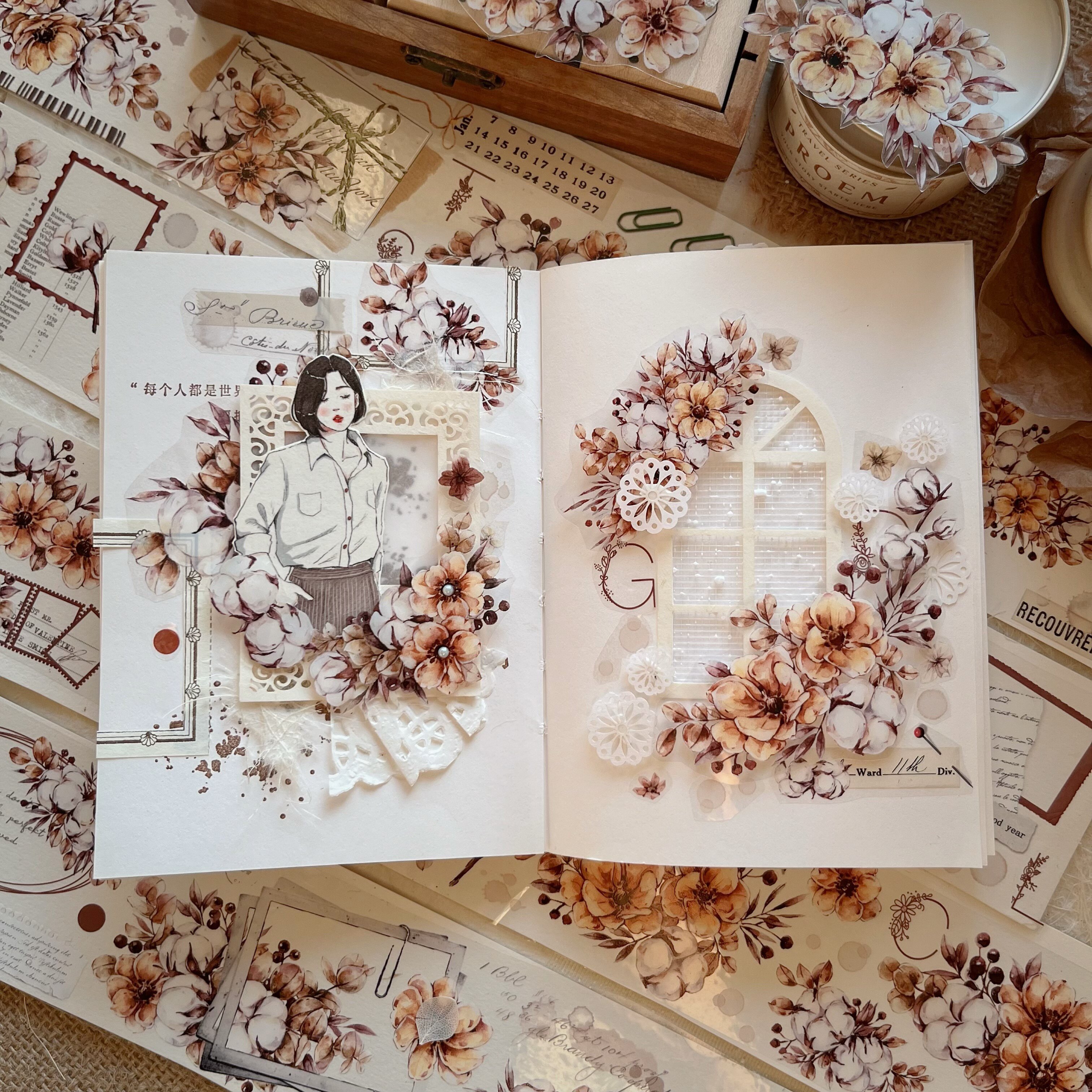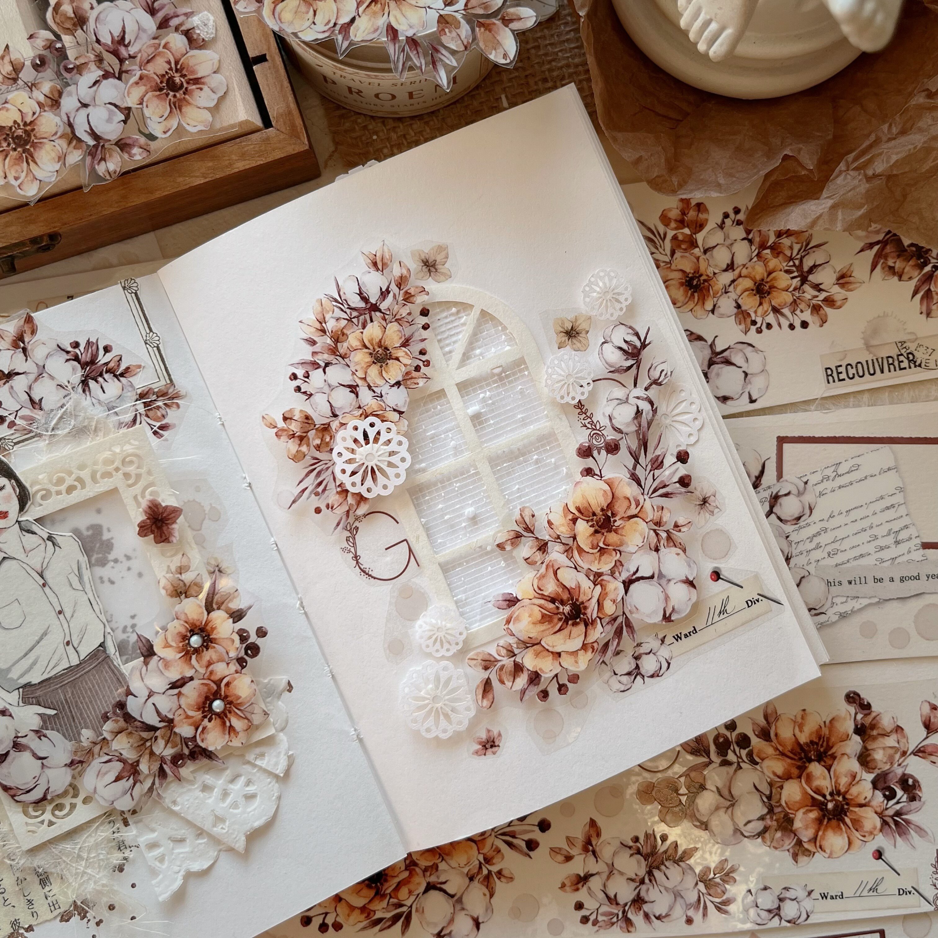 📚 壹洱原创和纸胶带新品现货【木棉】轻复古棉花手帐pet贴纸 银莲花