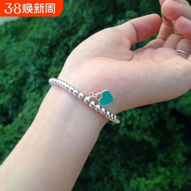 📚 s925纯银心形手链女蓝色爱心吊坠银珠手串珐琅T家提夫尼同款佩戴