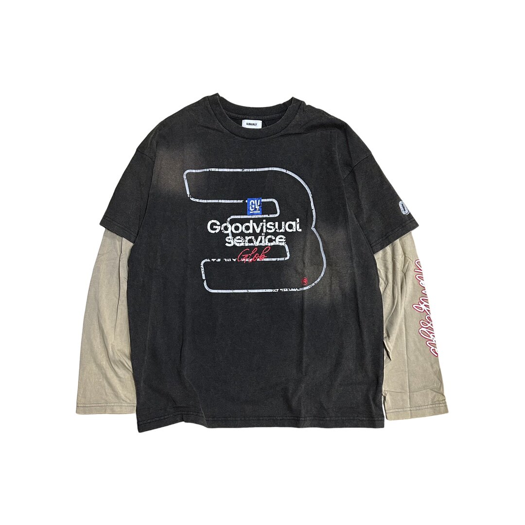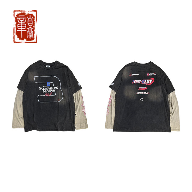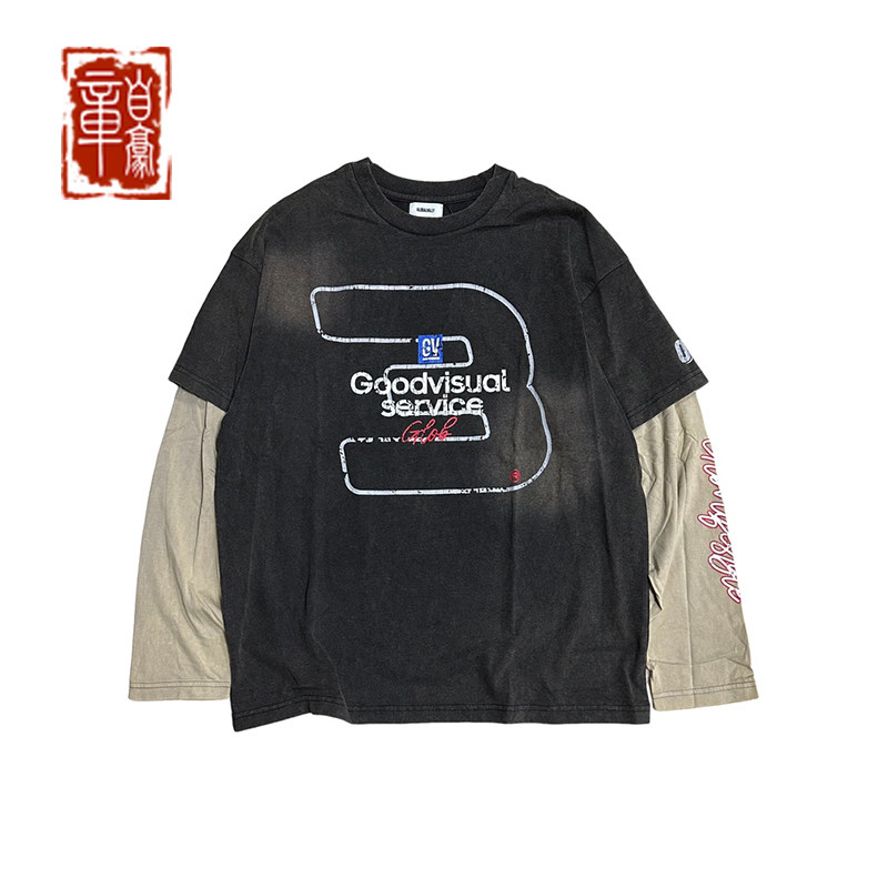 📚 章自豪 GLOBALVALLY 夏季新款3周年喷脏做旧印花假两件长袖T恤男