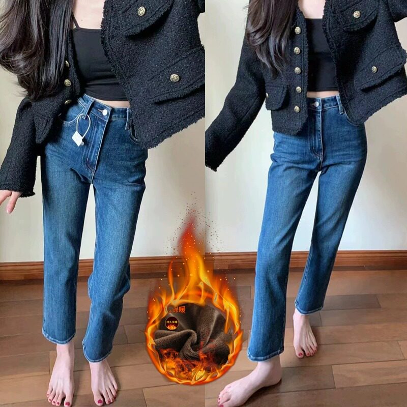 📚 窄版直筒牛仔裤女九分2023秋冬新款高腰显瘦八分小个子加绒烟管裤